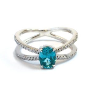 An 18k white gold diamond and oval blue zircon ring. Retails at $2,040.