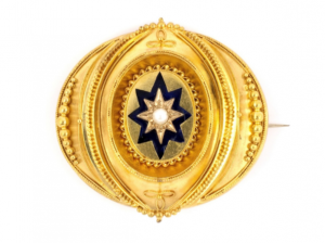 A locket is thoughtful, romantic and sentimental. While modern lockets are most often pendants, vintage lockets present other options, such as this striking brooch. A picture, a lock of hair or other memento is placed in a frame on the reverse side. This beautiful Etruscan revival Victorian brooch in yellow gold with blue enamel and a single pearl was created and used as a tribute to love.