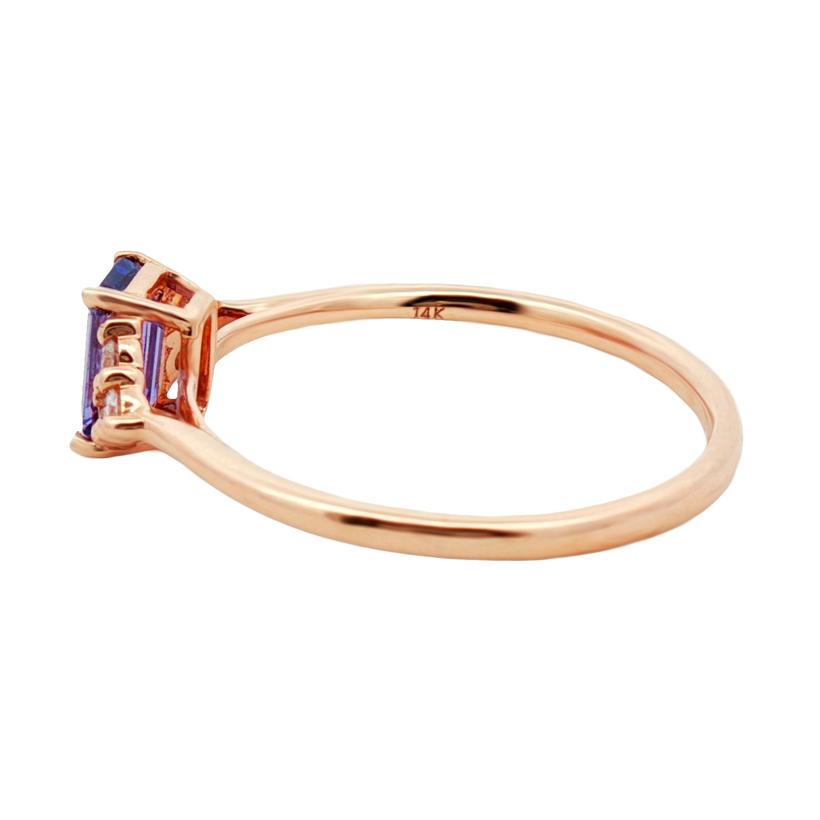 14 Karat rose gold ring set with a .55 carat emerald cut tanzanite and 6 full cut diamonds totaling .09 carat. Current size 6 3/4.
