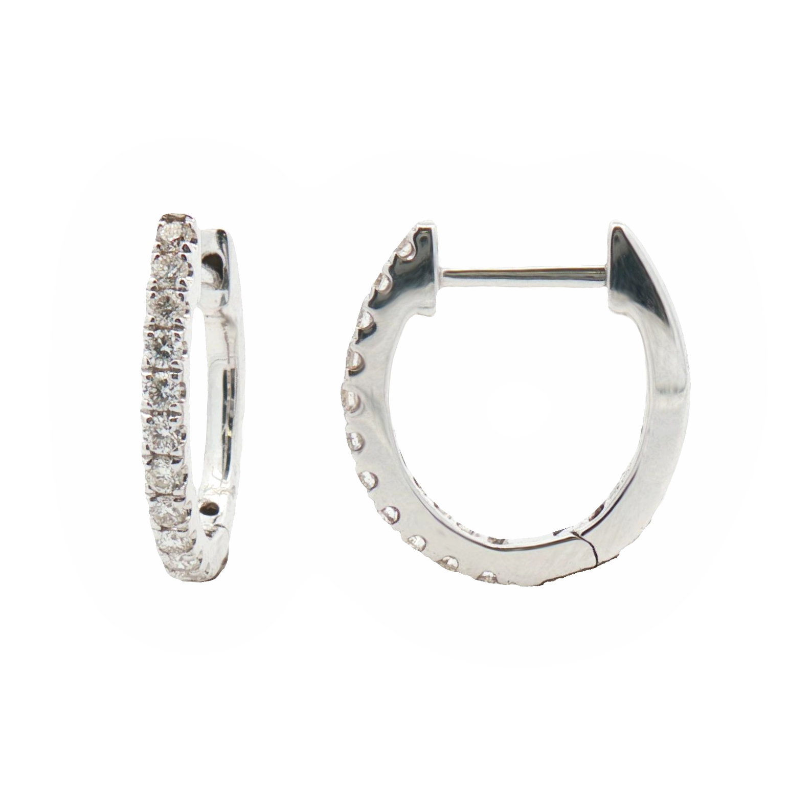 14 Karat white gold huggie hoop earrings set with 22 diamonds totaling .32 carat. 1/2″ wide.