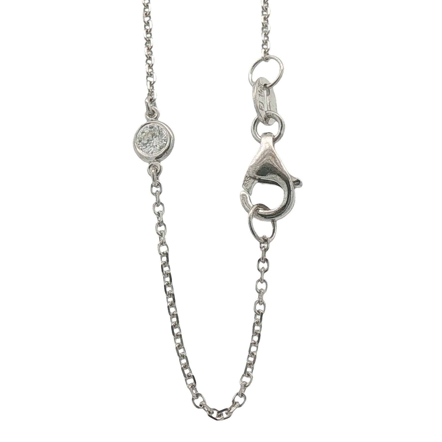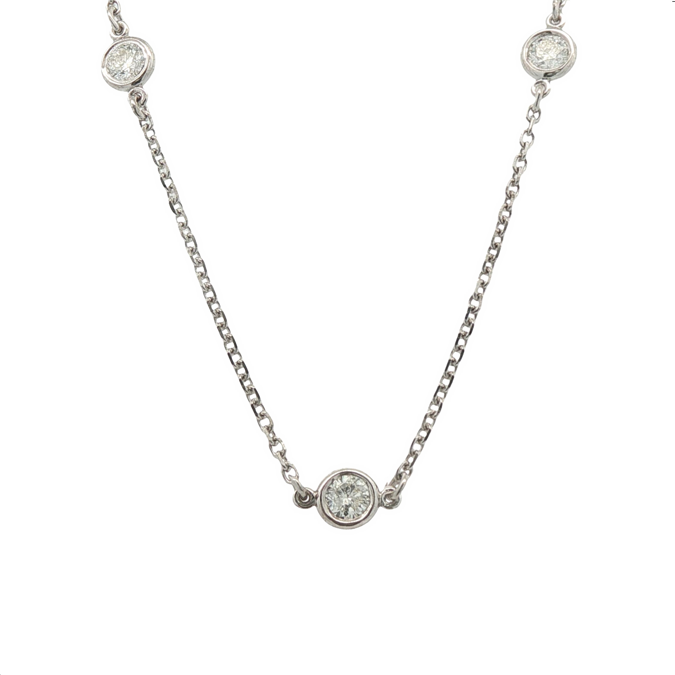 14 Karat white gold station necklace bezel set with 12 diamonds totaling .90 carat. 18″