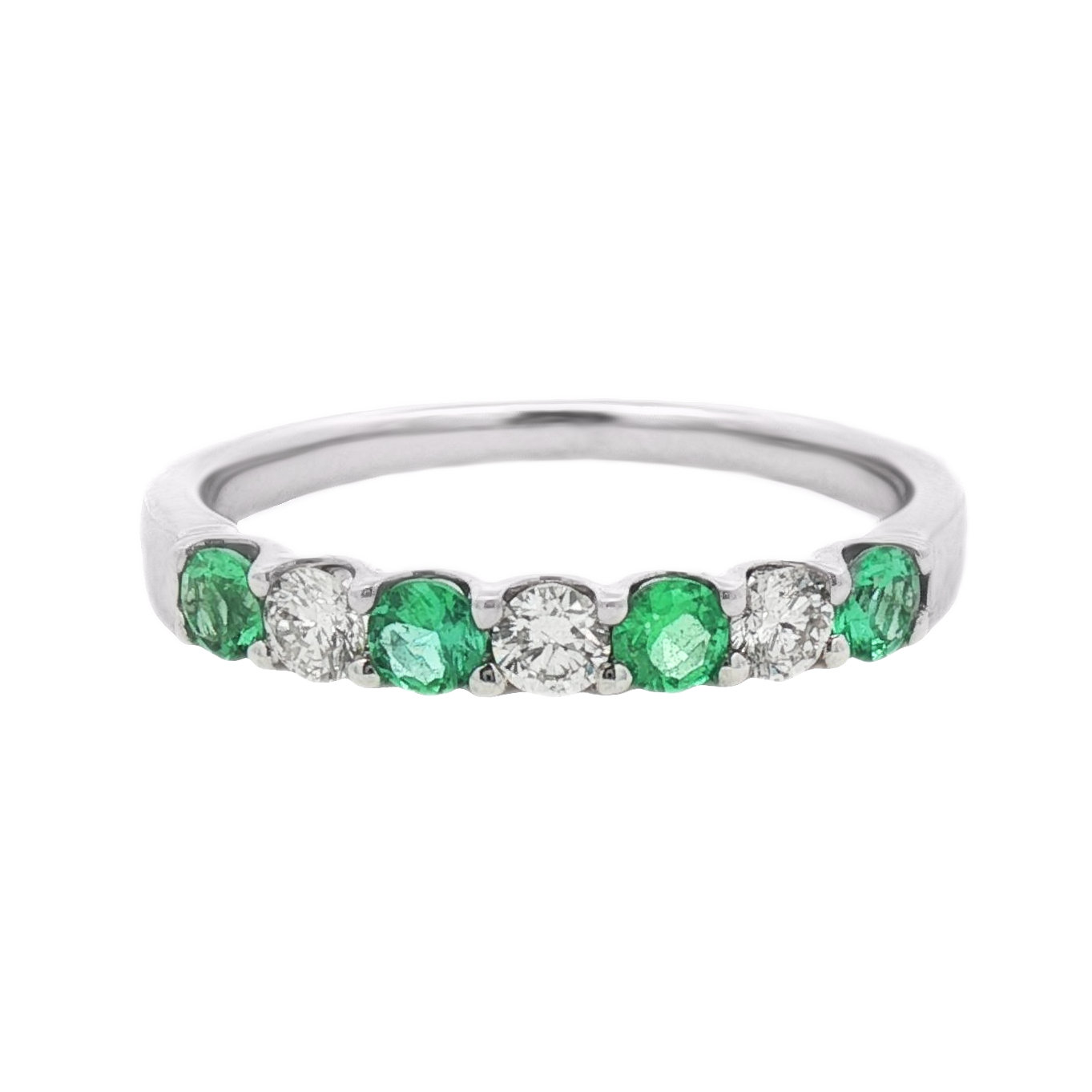 14 Karat white gold wedding ring set with 4 emeralds totaling .29 carat and 3 diamonds totaling .21 carat. Current size 6 1/2.
