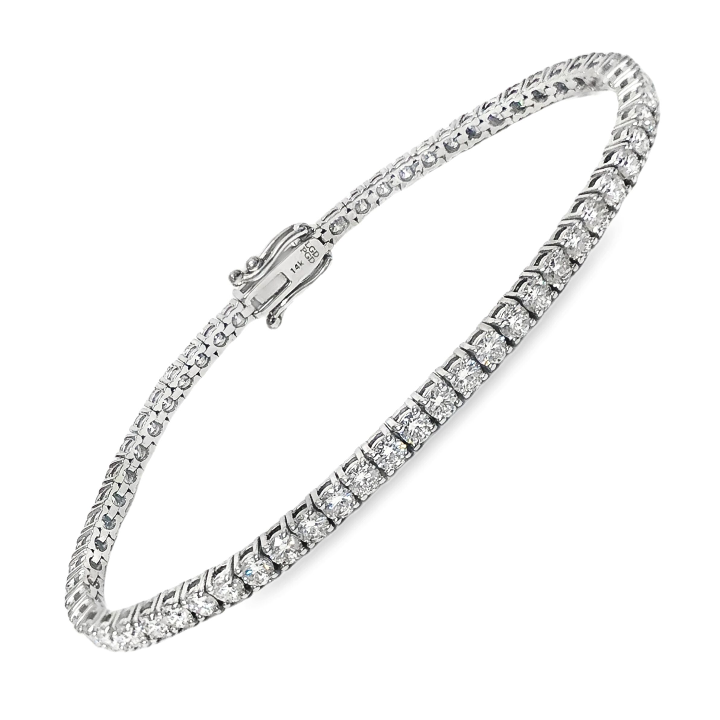 14 Karat white gold in-line bracelet set with 61 lab-grown diamonds totaling 5 carats. 7″