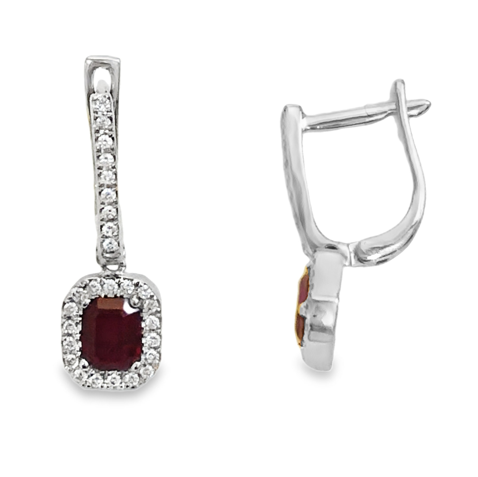14 Karat white gold drop earrings set with 2 emerald cut rubies totaling 1.30 carat and 54 diamonds totaling .22 carat. 3/4″ in total length.