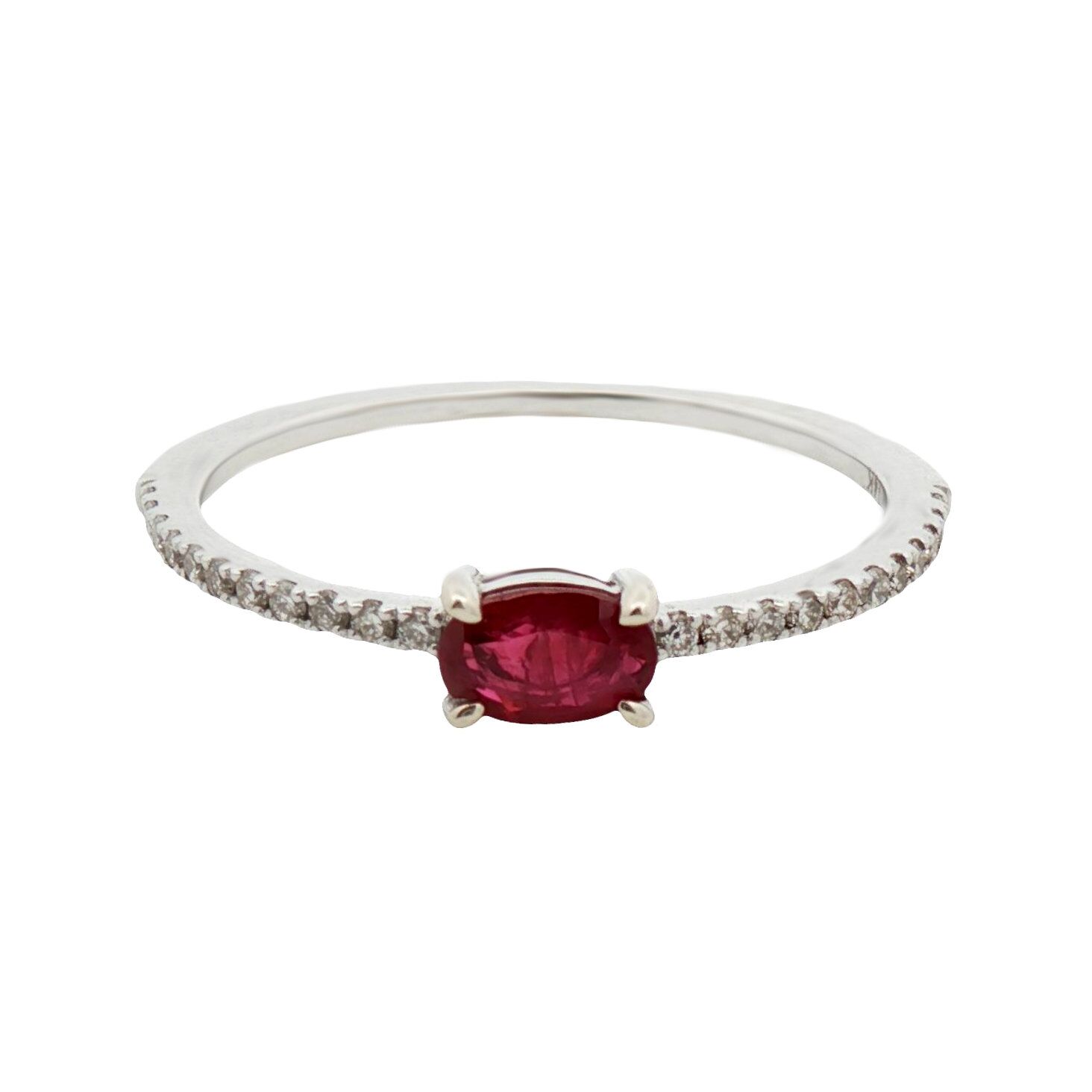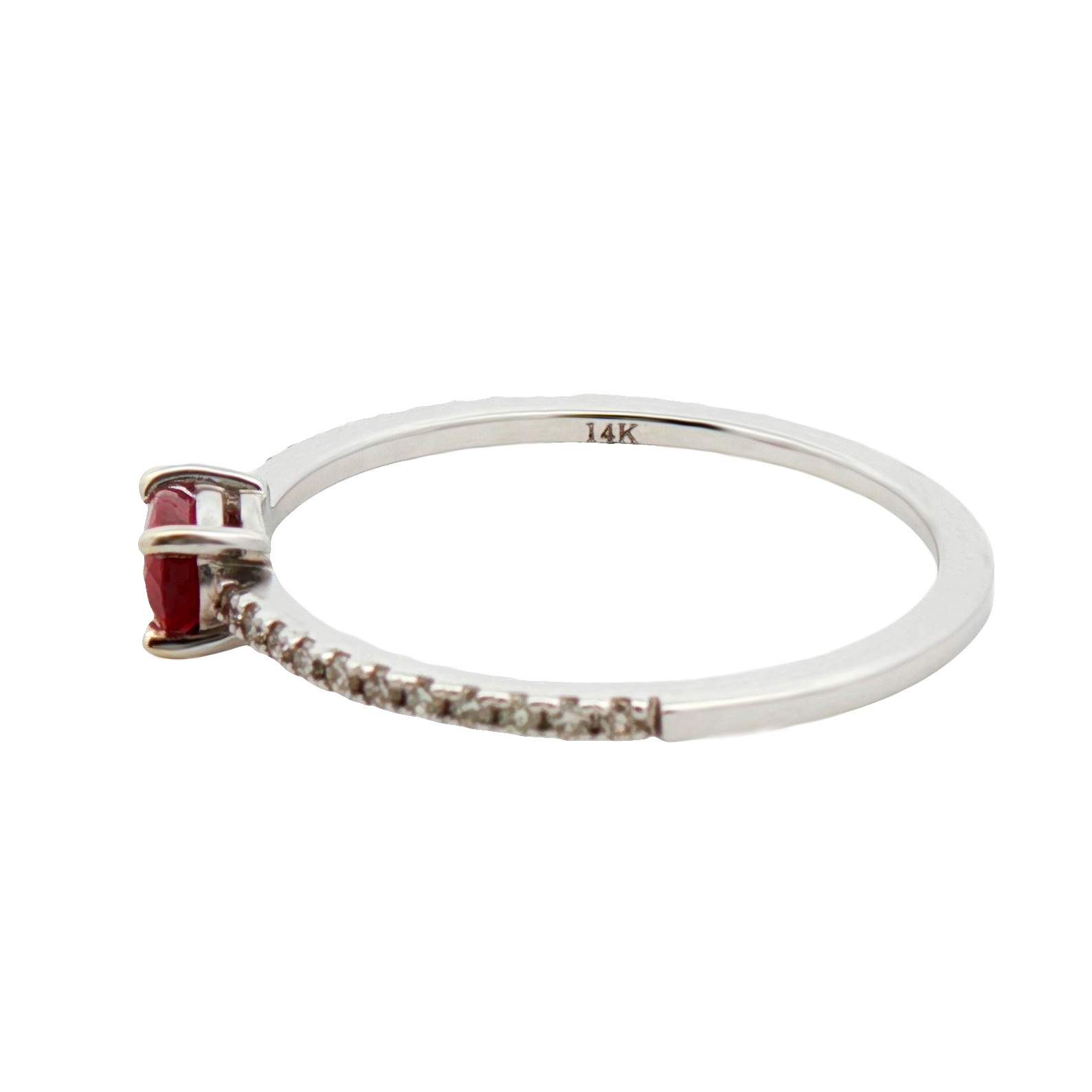 14 Karat white gold ring set with a .34 carat oval ruby and 22 diamonds totaling .12 carat. Current size 6 1/2.