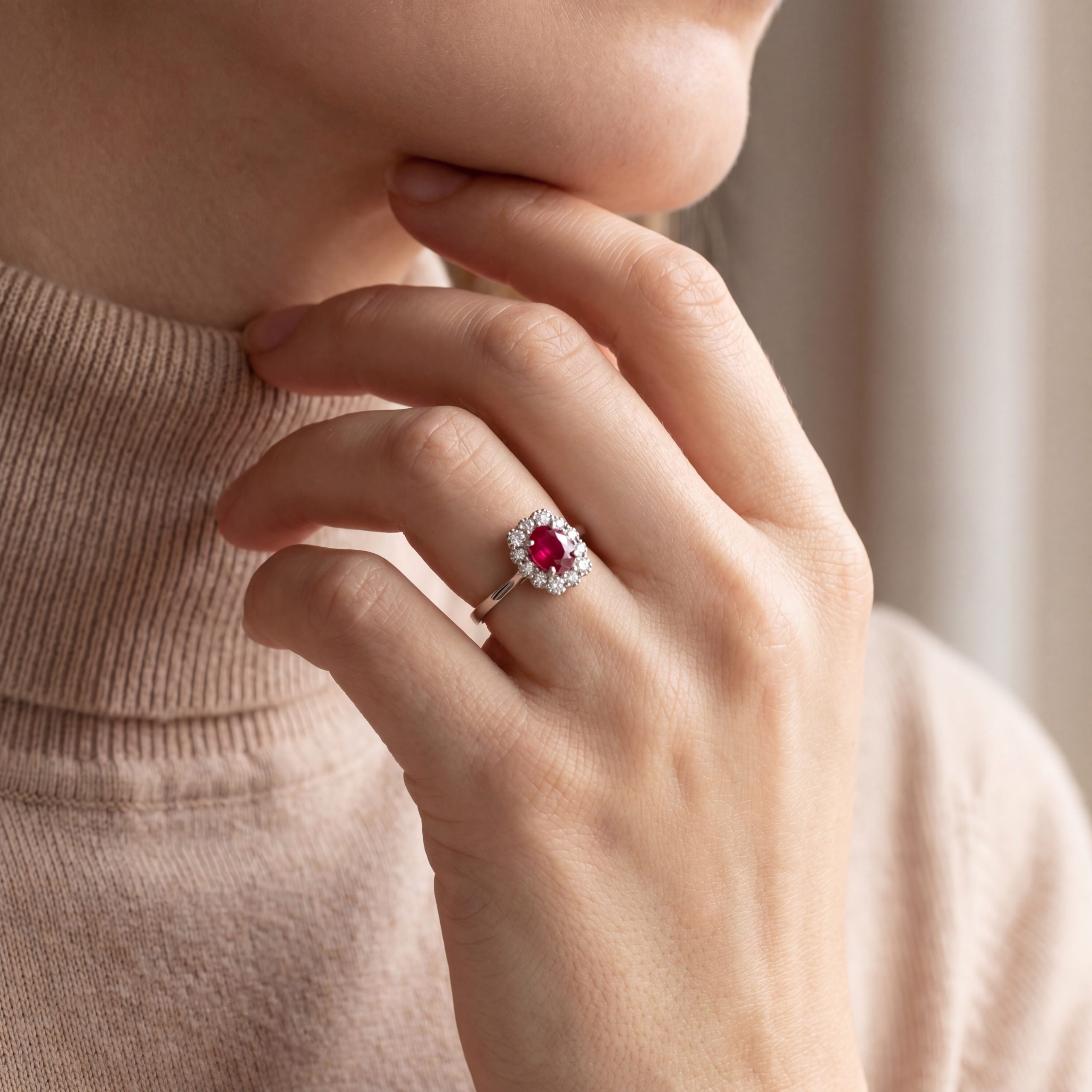 14 Karat white gold ring set with a .48 carat ruby and 12 diamonds totaling .20 carat. Current size 6 3/4.