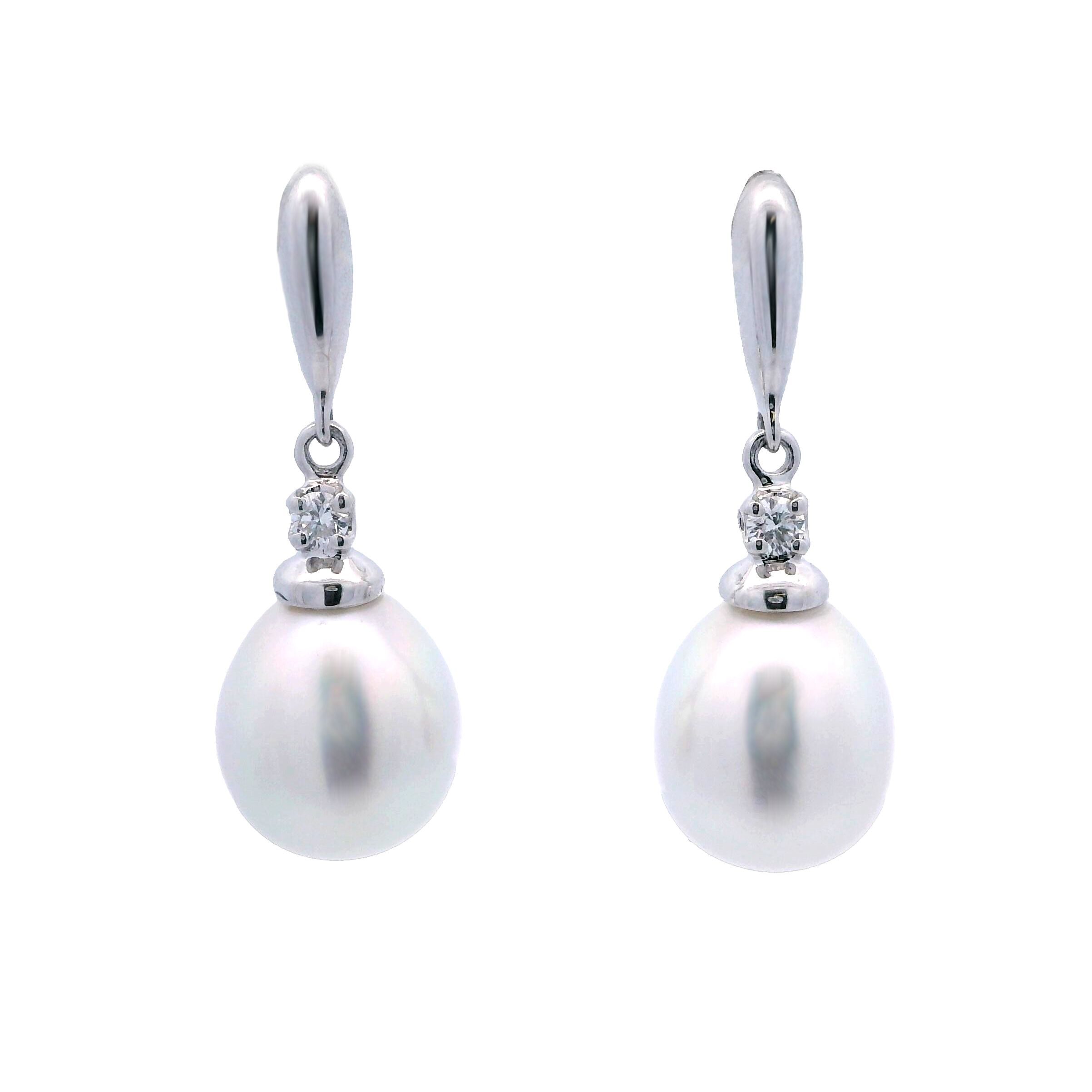 14 Karat white gold drop earrings set with 2 baroque 9 x 10 mm South Sea cultured pearls and 2 diamonds totaling .08 carat. Friction backs. 1″ in total length.