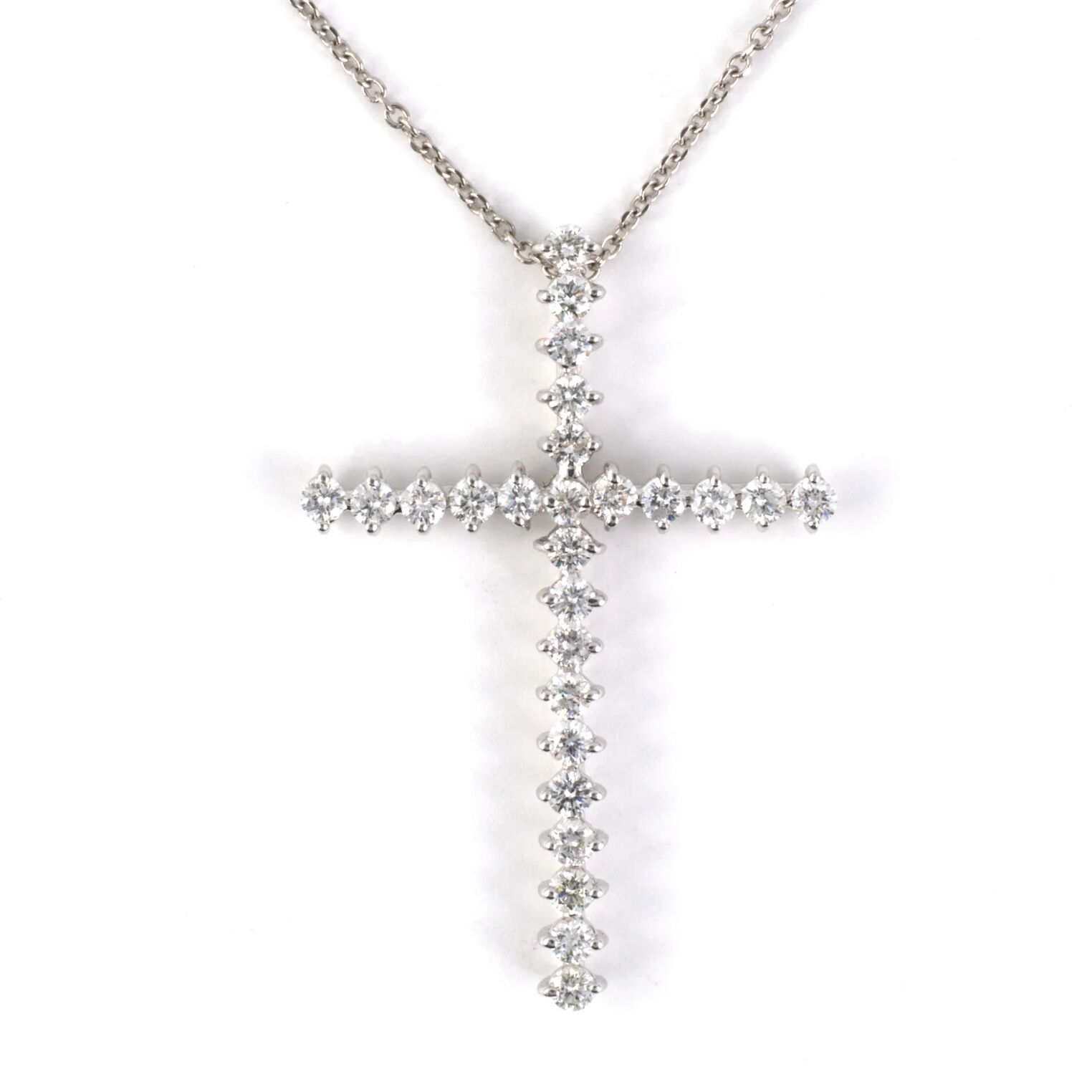 14 Karat white gold vintage cross pendant prong set with 26 diamonds totaling about 1.15 carats on a 16″ white gold cable chain. Pendant is 1 1/2″ x 1″.