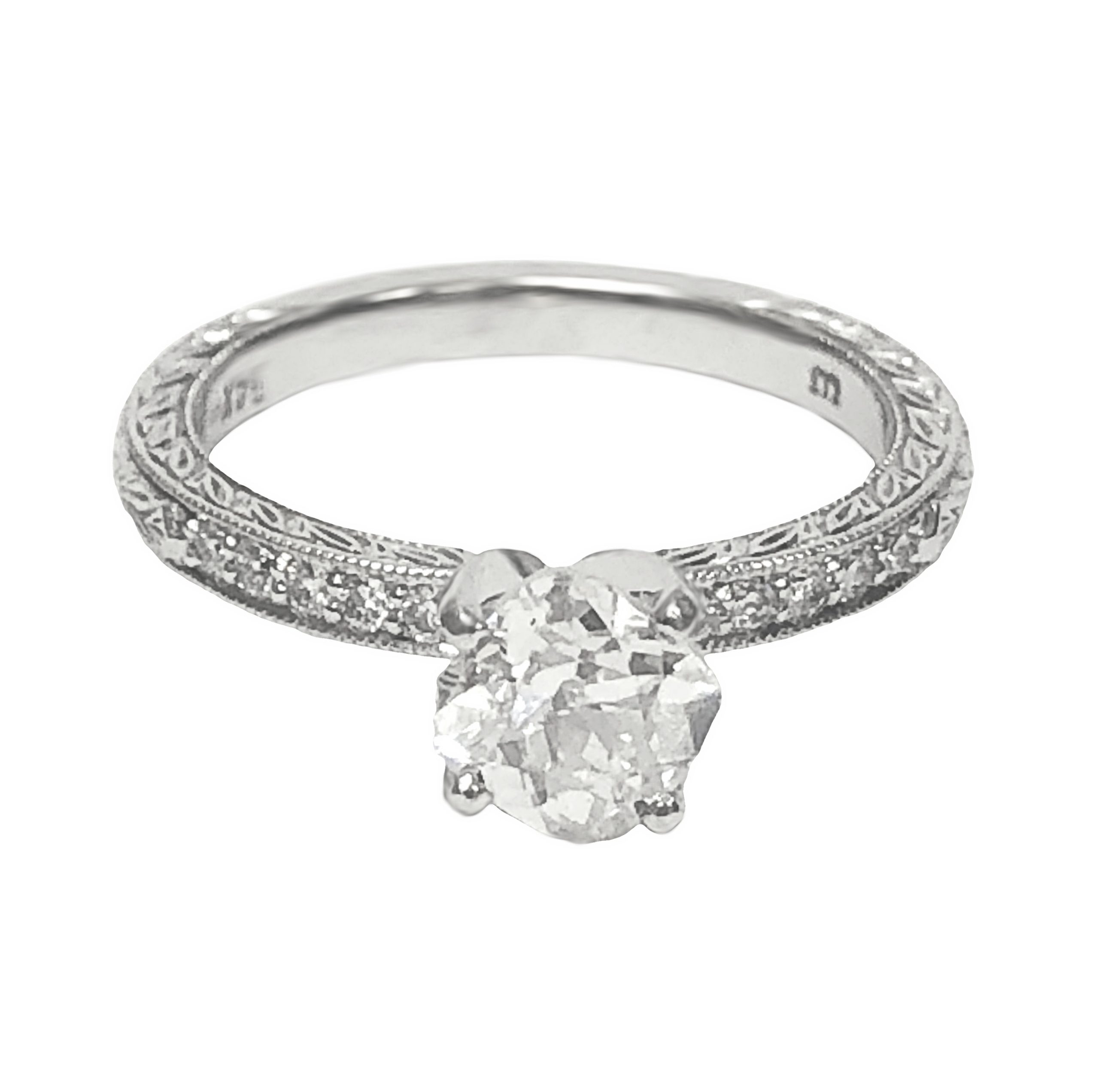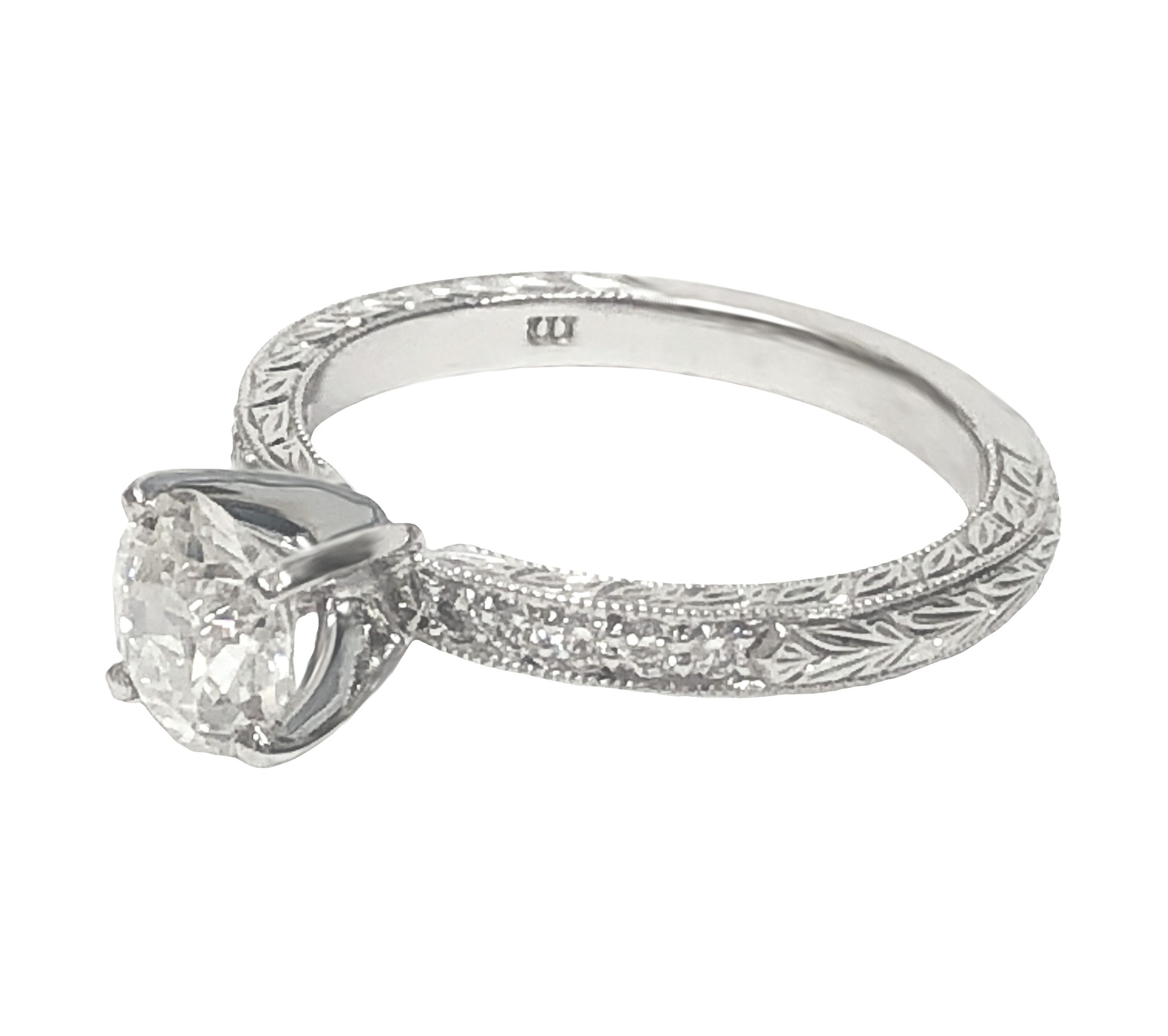 14 Karat white gold vintage engagement style ring with chased & milgrain trim set with an approximately 1.01 carat center antique cushion shaped diamond and 10 full cut diamonds totaling .15 carat. Current size 6 1/2.