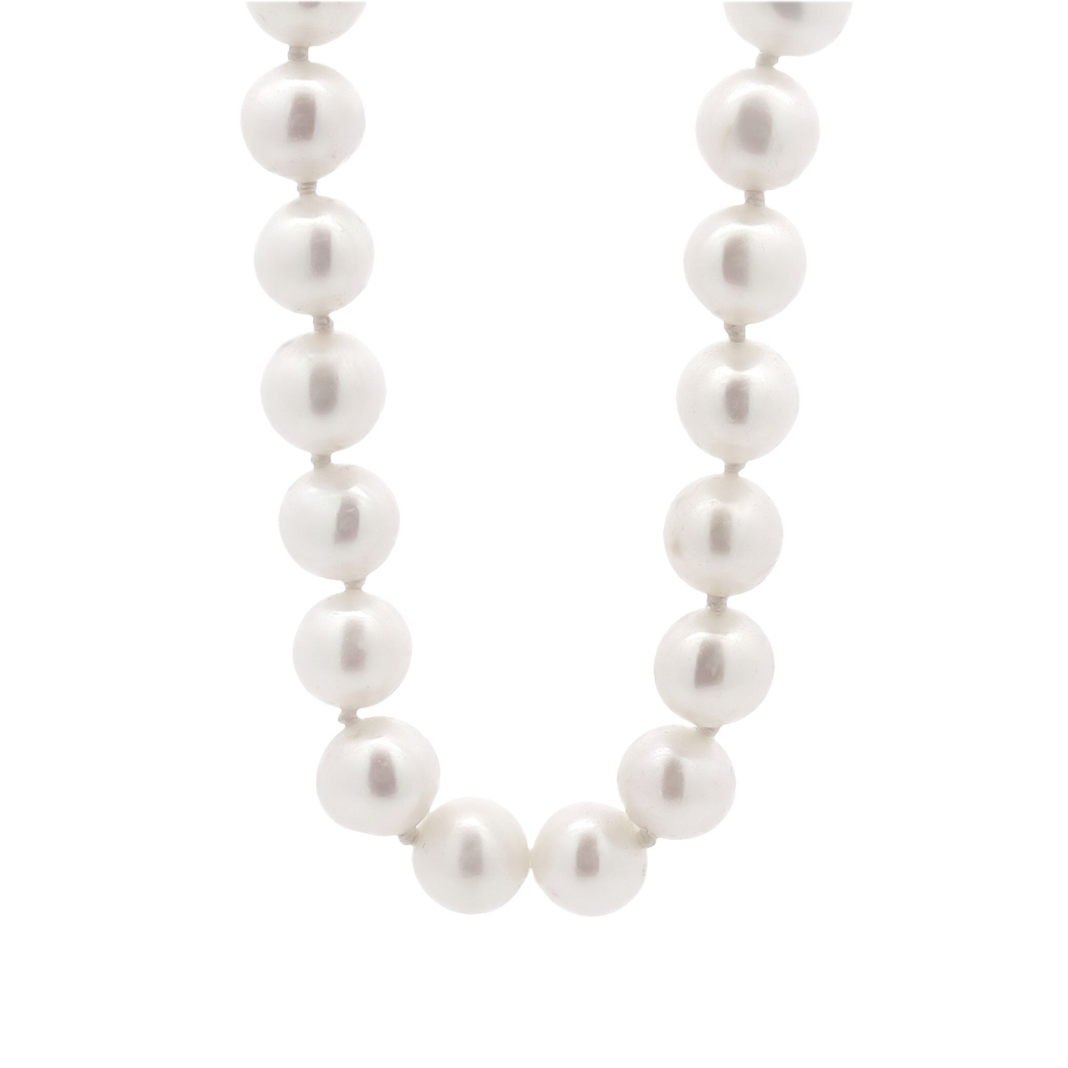 Necklace with 68 Akoya cultured pearls and a 14 Karat yellow gold filigree fishhook clasp. 18″. Pre-owned.