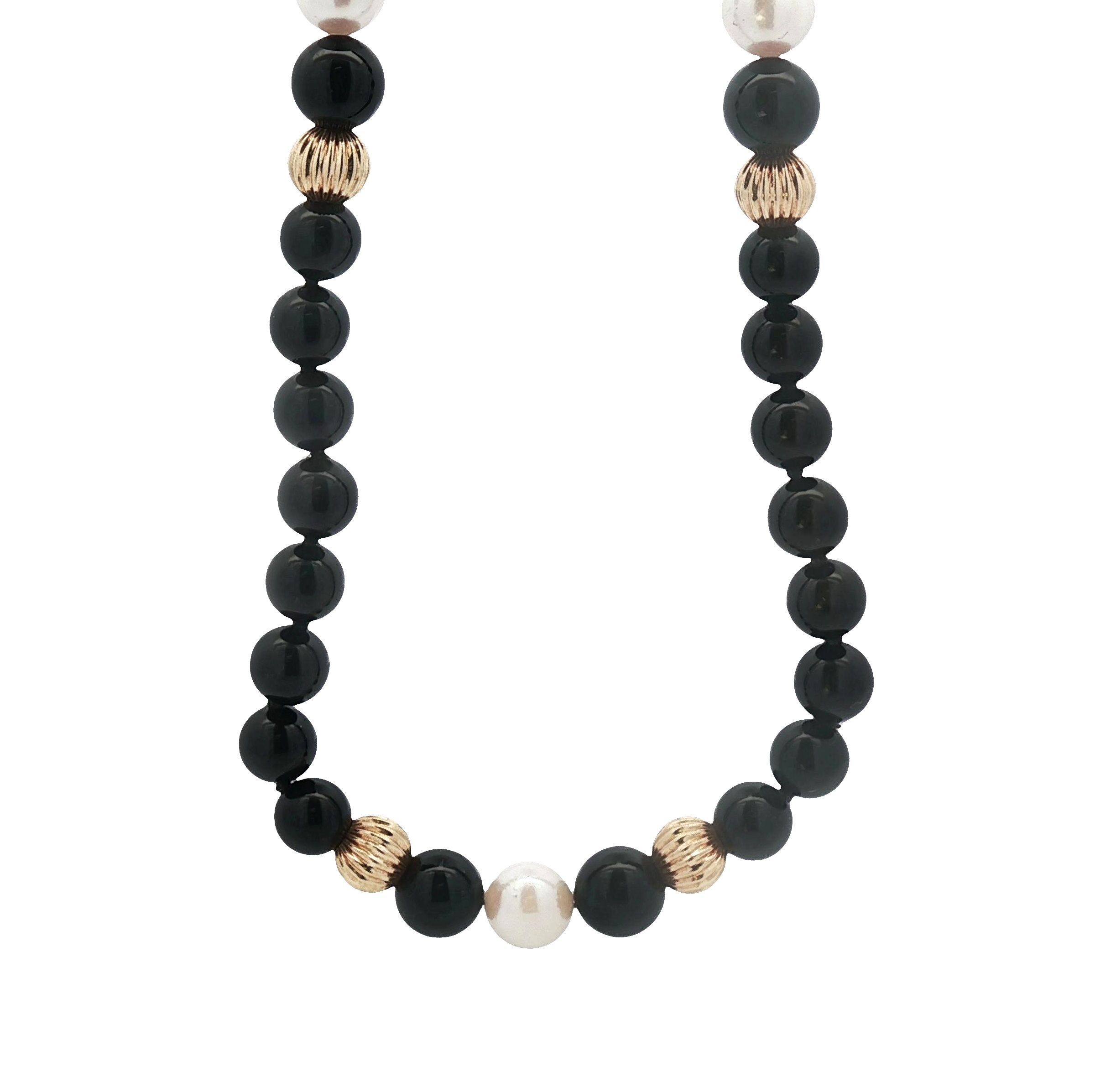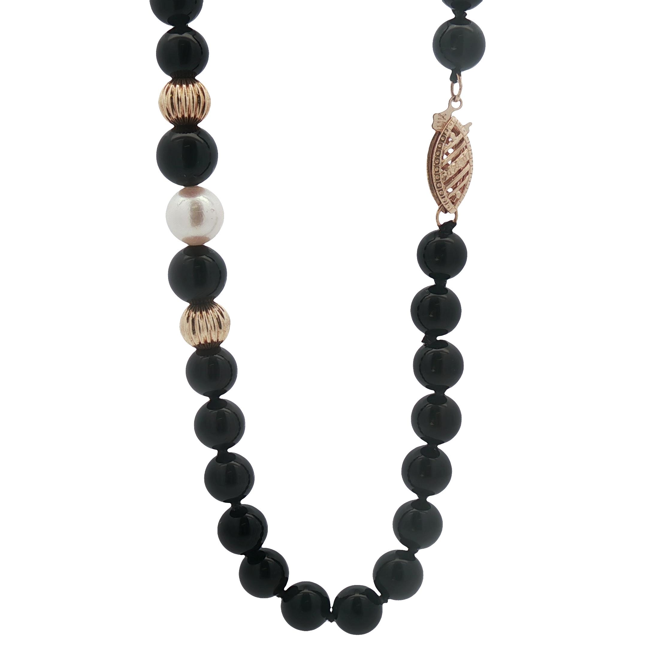 21.5″ necklace with 70 black chalcdedony beads, 10 – 6.5mm ribbed gold beads, 5 – 6mm cultured pearls and 14 Karat yellow gold filigree fish hook clasp. Pre-owned.