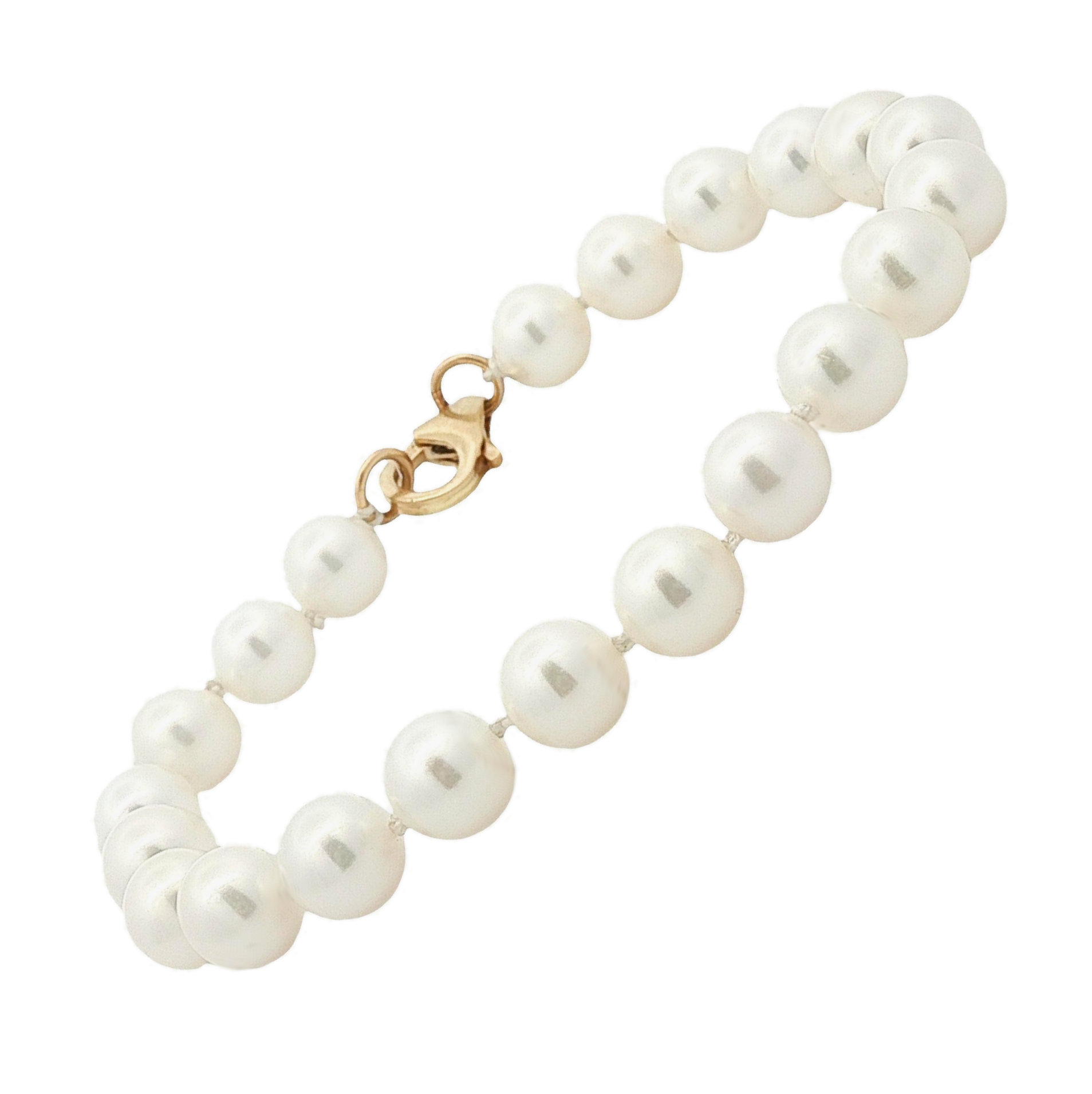 Bracelet with 21 – 6.3mm cultured freshwater pearls and a 14 Karat yellow gold teardrop clasp. 6 1/2″