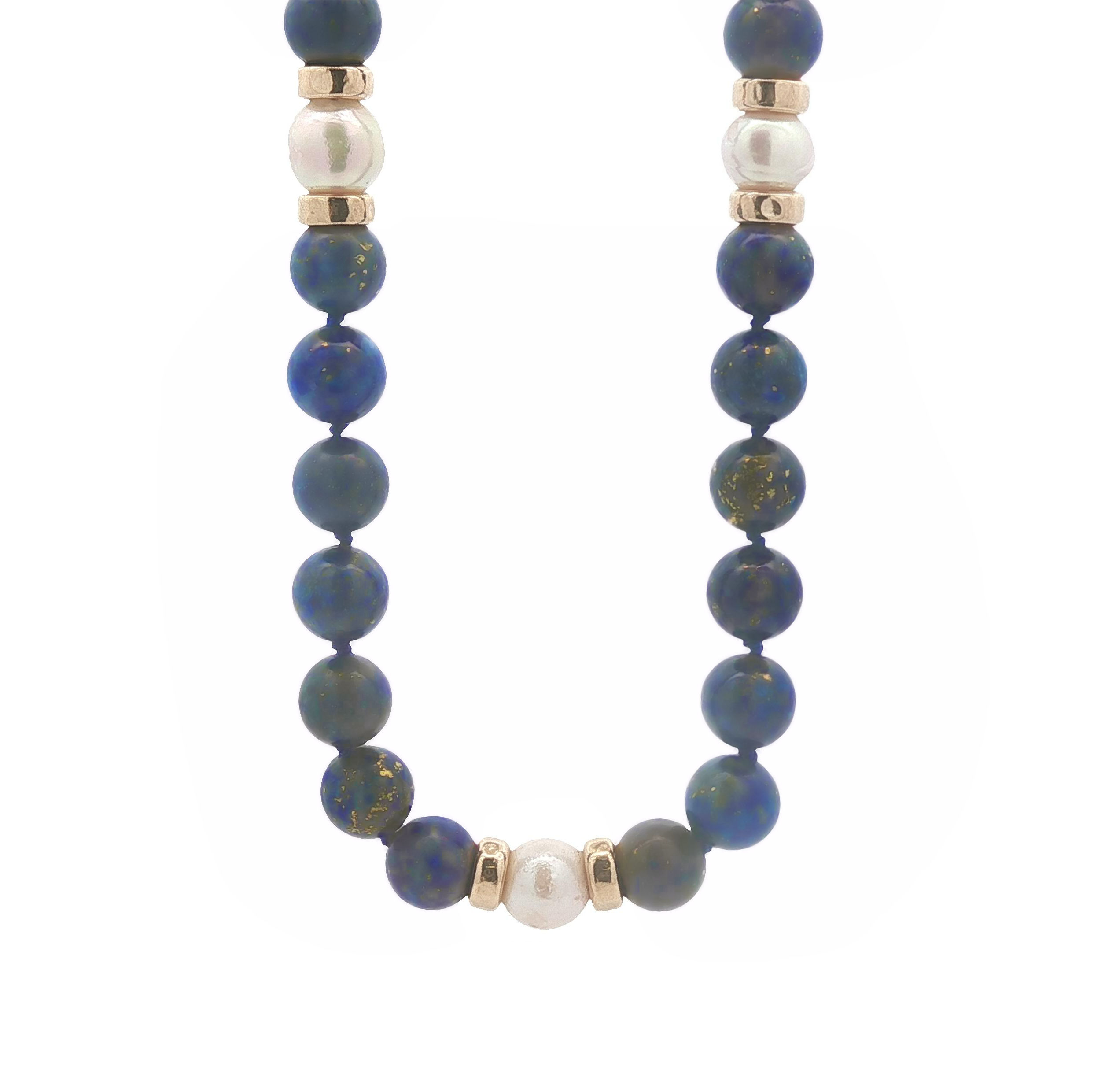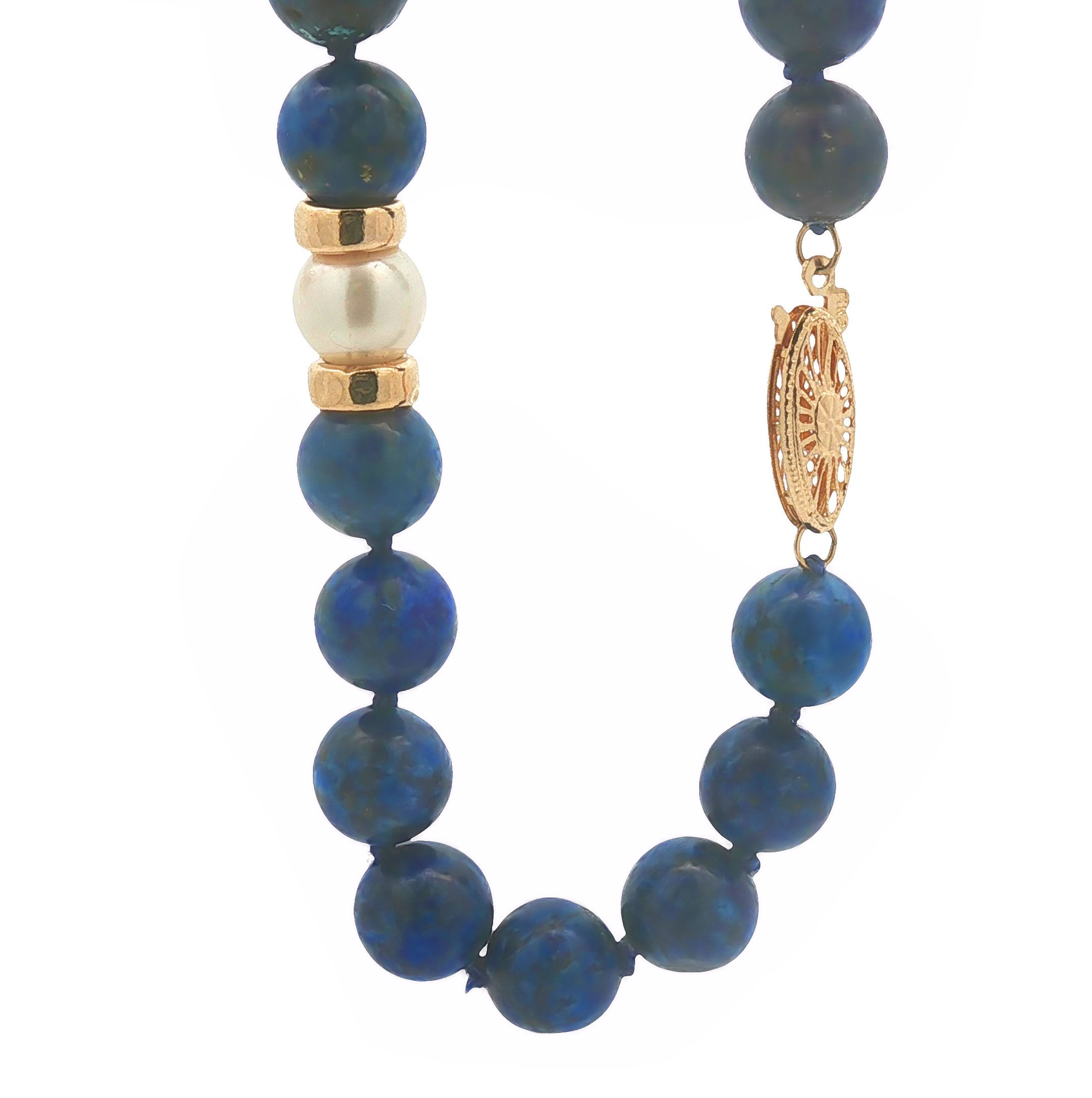 24″ necklace with 14 – 14 Karat yellow gold rondels, 7 – 8mm cultured pearls, and 58 – 8mm lapis beads. Pre-owned.