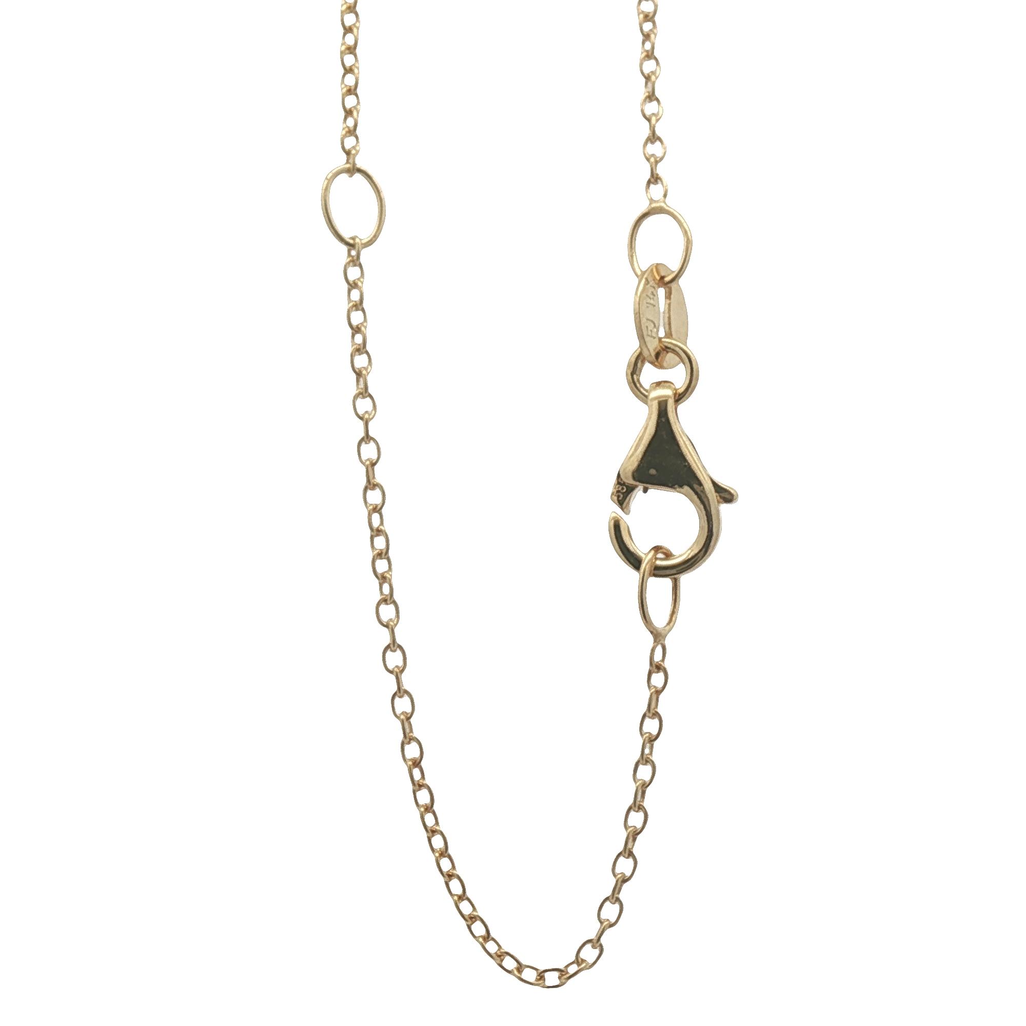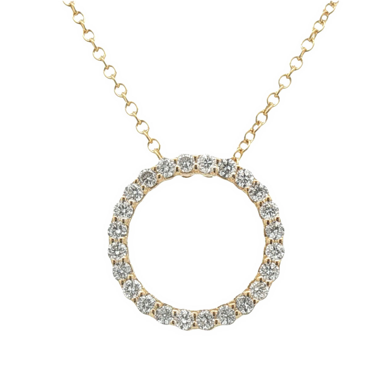 14 Karat yellow gold circle pendant set with 24 diamonds totaling .30 carat on a 16/18″ 14 Karat yellow gold cable chain with teardrop clasp. Pendant is 1/2″ in diameter.
