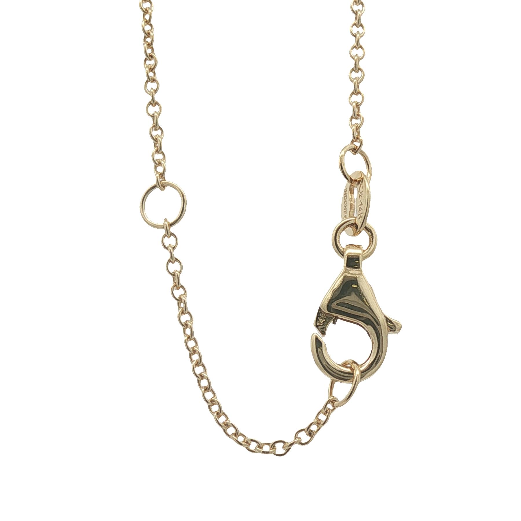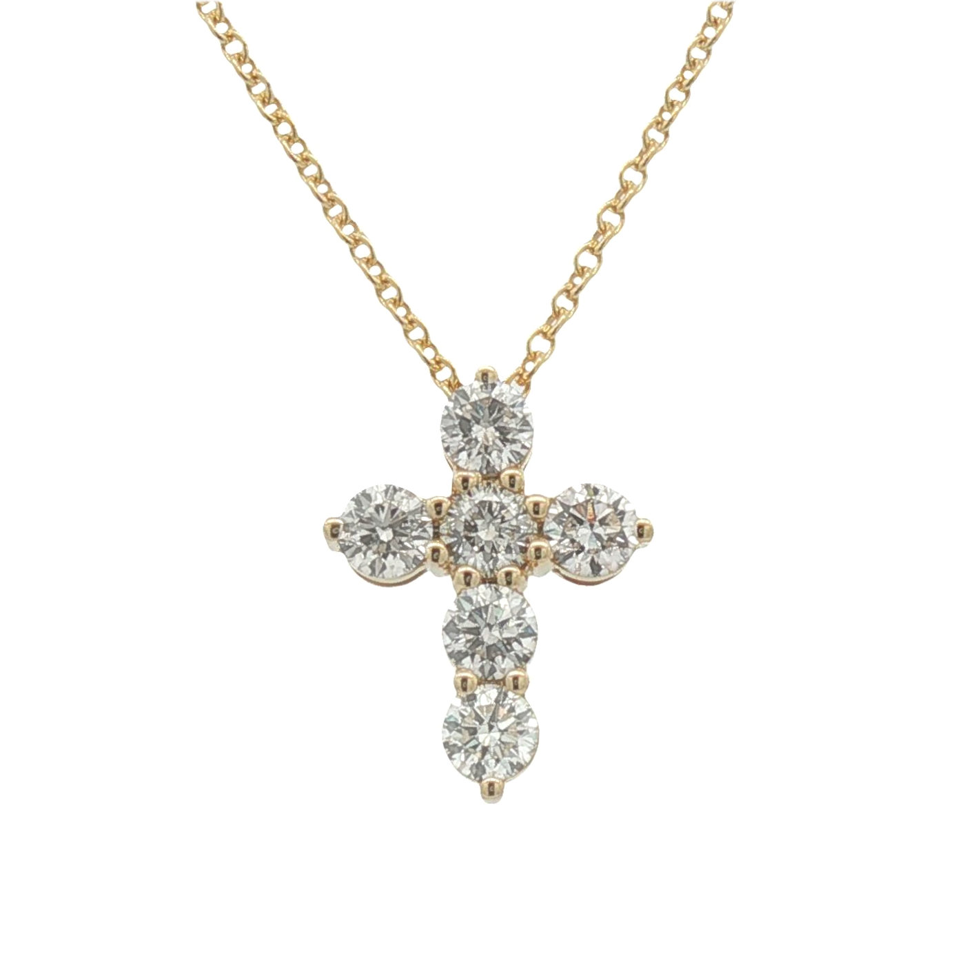 14 Karat yellow gold cross pendant set with 6 diamonds on a 17/18″ 14 Karat yellow gold cable chain with teardrop clasp.