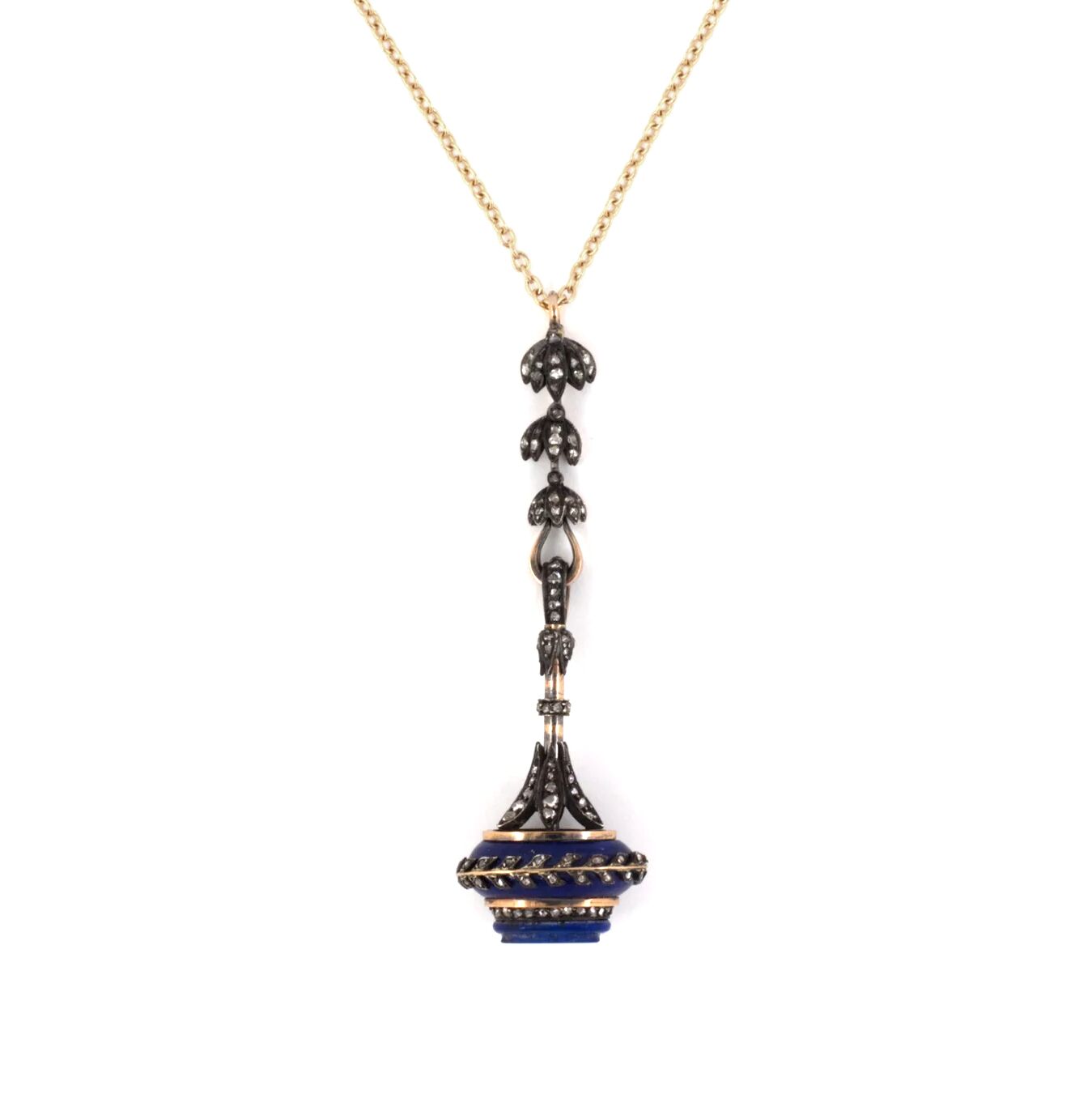 14 Karat yellow gold & silver French Victorian vintage watch fob pendant set with 2 oval lapis and 150 rose cut diamonds totaling about 1.25 carat on a 14 Karat yellow gold cable chain. Pendant is 2 1/4″ in total length.
