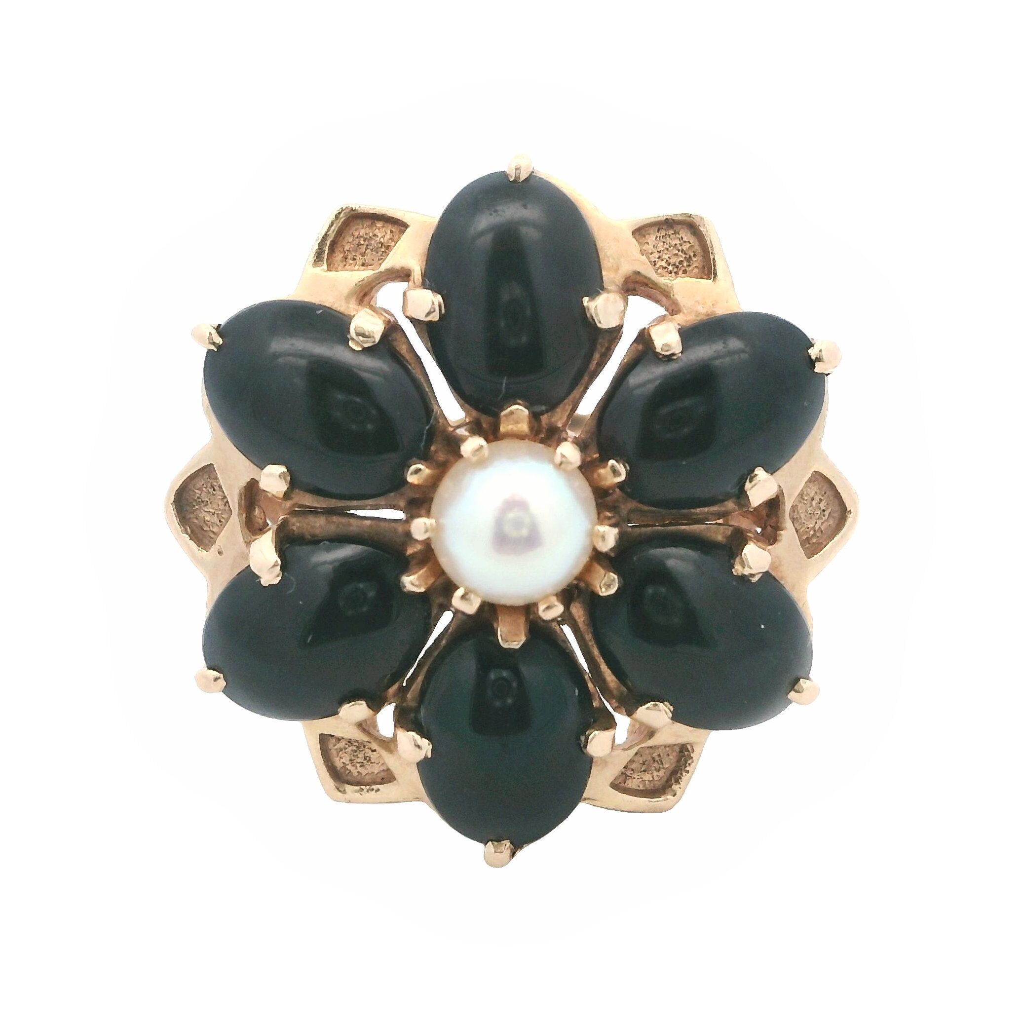 14 Karat yellow gold vintage flower ring set with a 4 mm Akoya cultured pearl and 6 oval cabochon onyx. Current size 6.