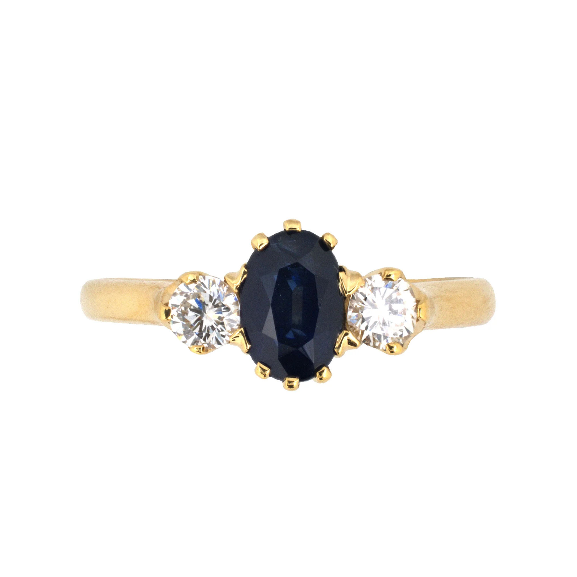 14 Karat yellow gold vintage ring set with an approximately .93 carat oval sapphire and 2 diamonds totaling about .26 carat. Current size 6 1/2.