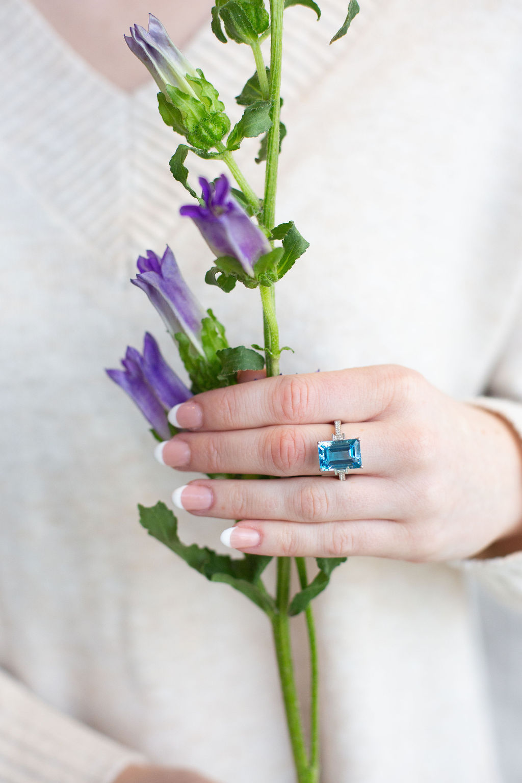 18 Karat white gold ring set with an approximately 9.71 carat 14x10mm emerald-cut Swiss blue topaz and 16 full-cut & emerald-cut diamonds totaling about 1/4 carat. Current size 7. Pre-owned.