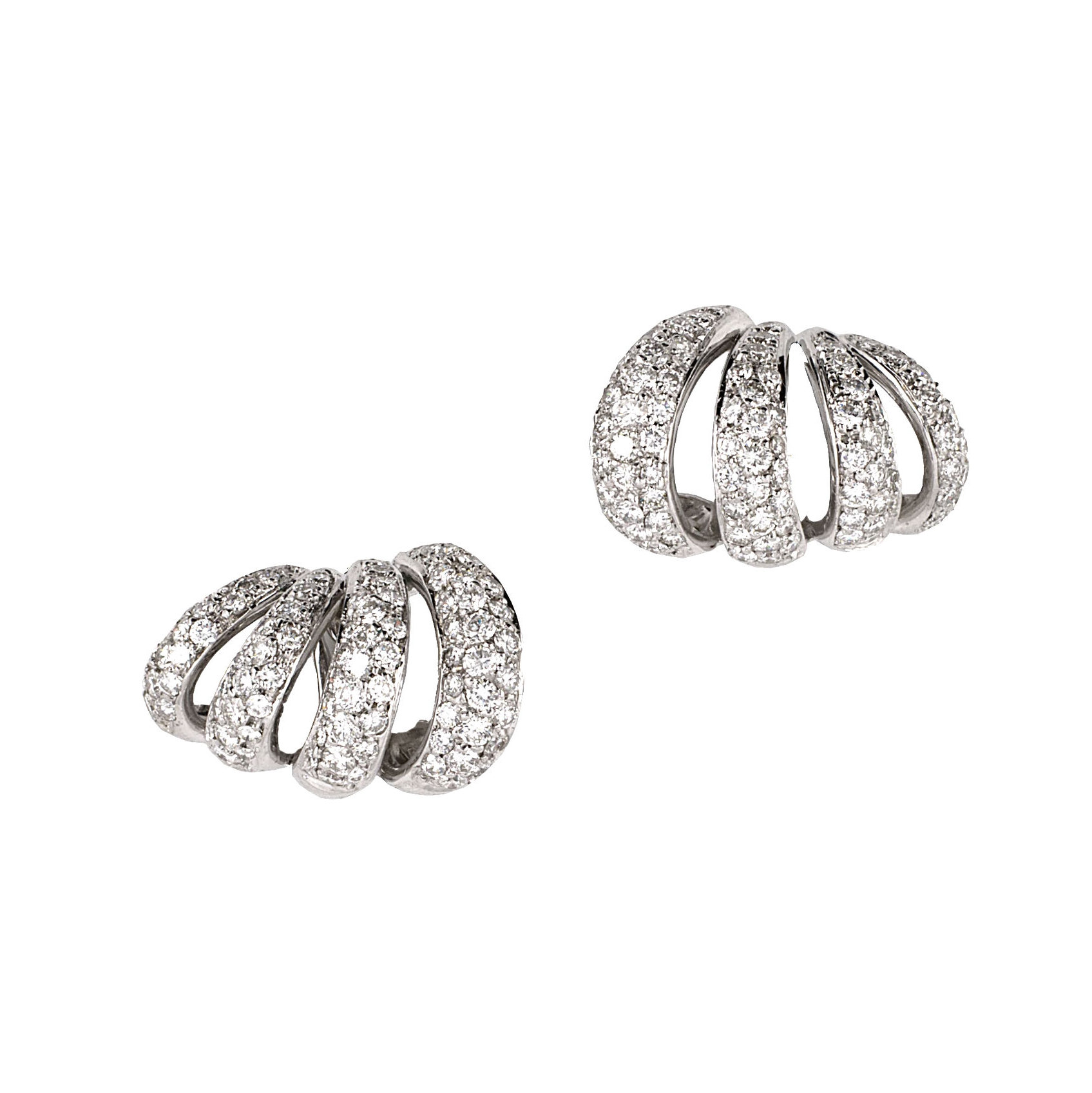 18 Karat white gold vintage curved section earrings pave set with 174 diamonds totaling about 3.70 carats. Italy. Clip backs.