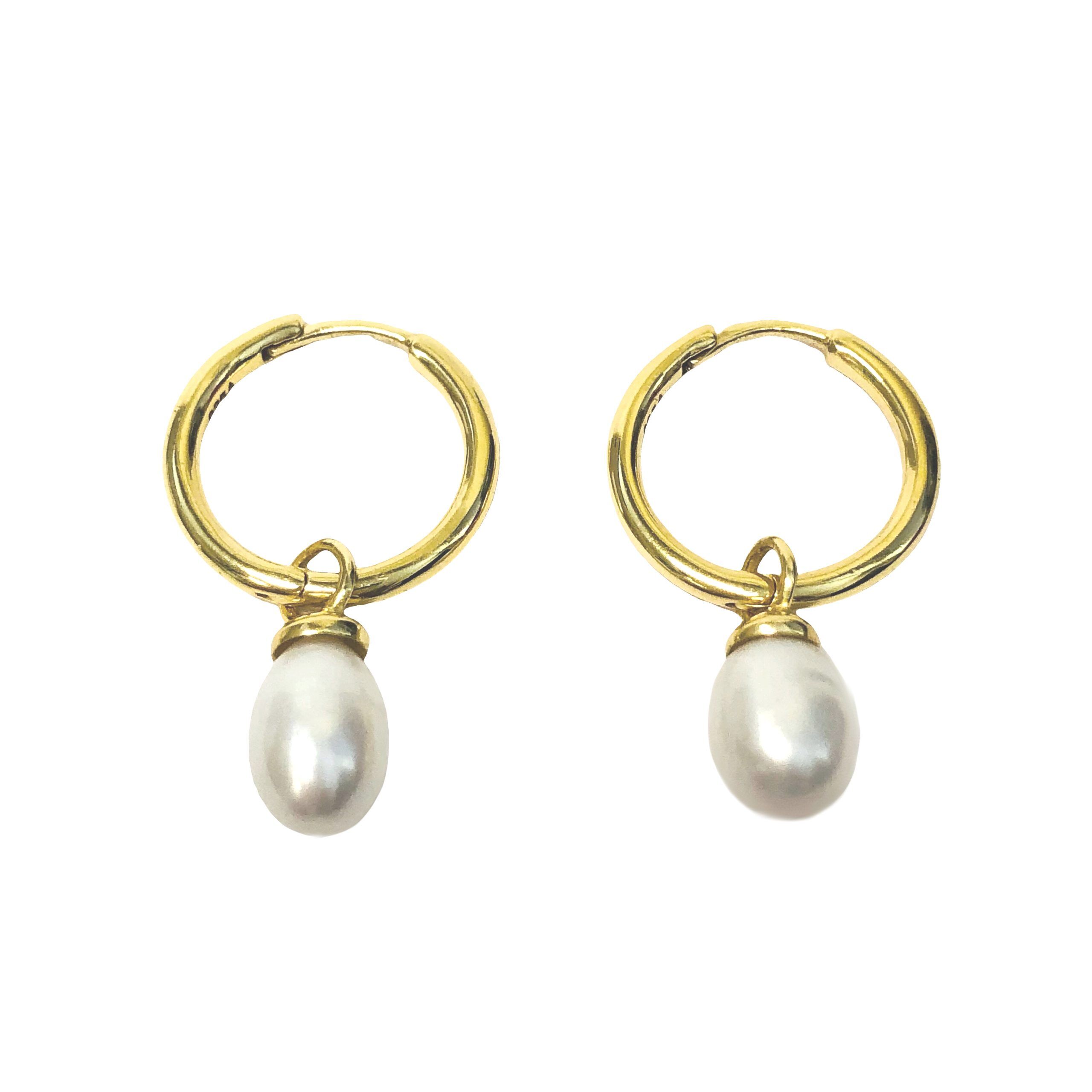 18 Karat yellow gold plated small hoop earrings with removable cultured pearl drops. Hoops are 11/16″ in diameter. Drops are 9/16″ in total length.
