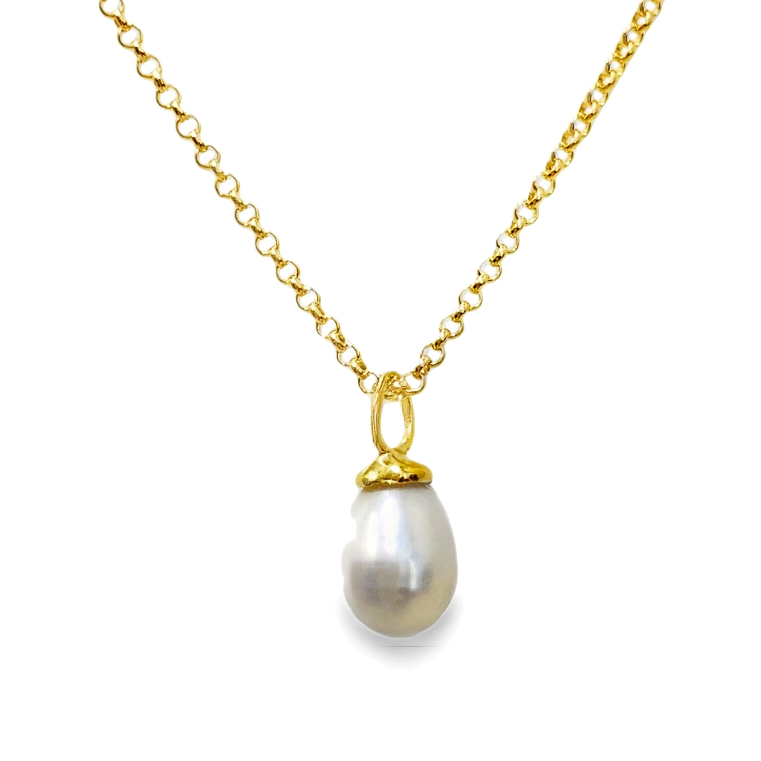 18 Karat yellow gold plated cultured pearl pendant on a 17.5″ yellow gold plated rolo chain. Pendant is 1/2″ in total length.