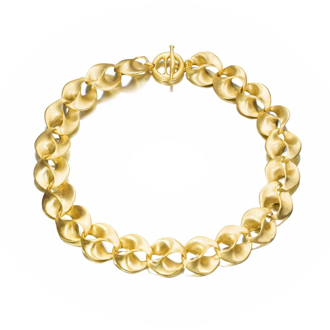 18 Karat yellow gold plated twisted link satin finish necklace with toggle clasp. 18.5″