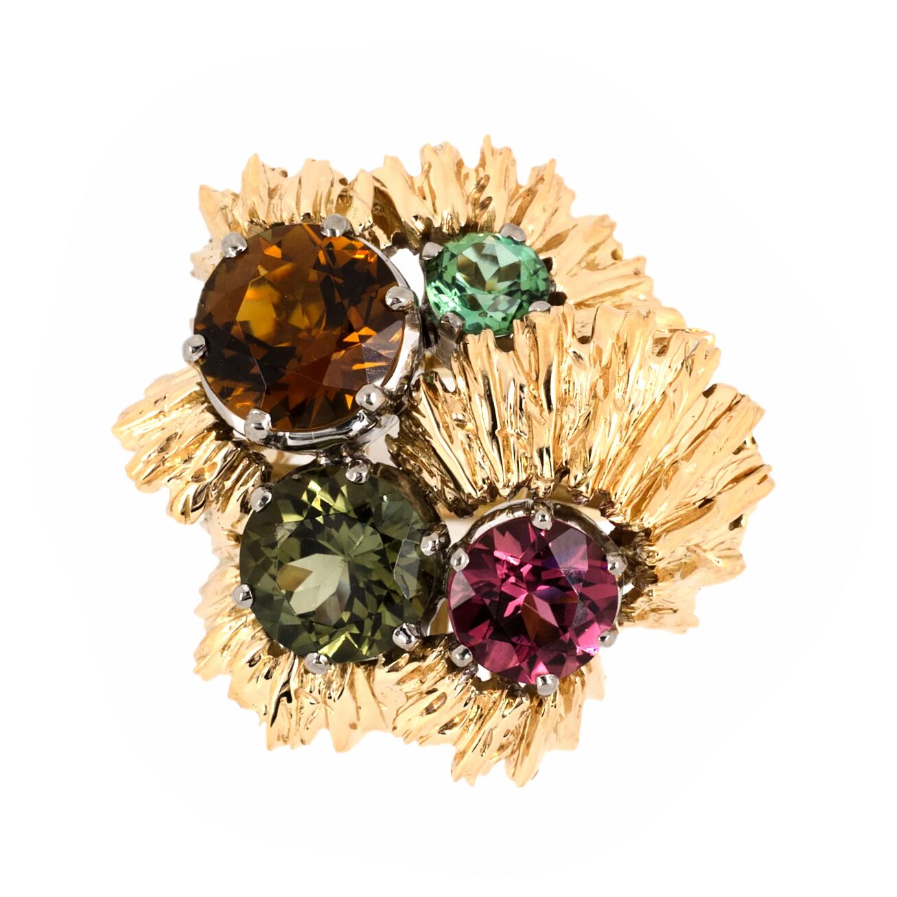18 Karat yellow gold & platinum vintage carved thistle-like tiered cocktail ring set with a 2.38 carat brown tourmaline, a 2.09 carat green tourmaline, a 1.15 carat pink tourmaline and a .55 carat green tourmaline. Circa 1970. Current size 6 1/4+.
