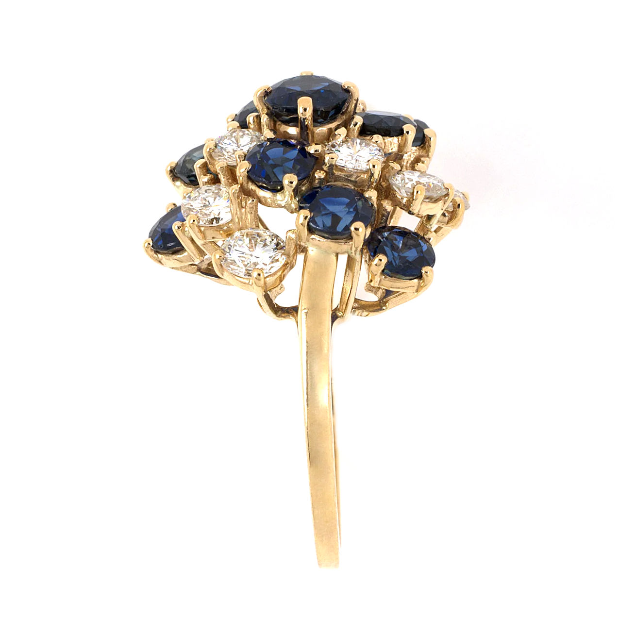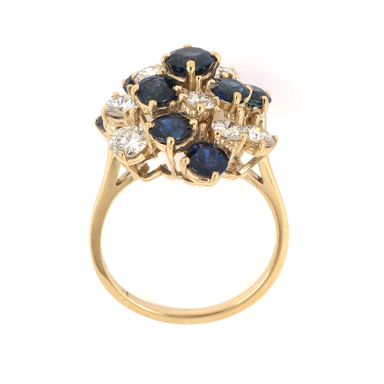 18 Karat yellow gold vintage swirl cluster ring set with 9 diamonds totaling about 1.25 carat and 10 sapphires totaling about 2.50 carat. Current size 6 1/4.