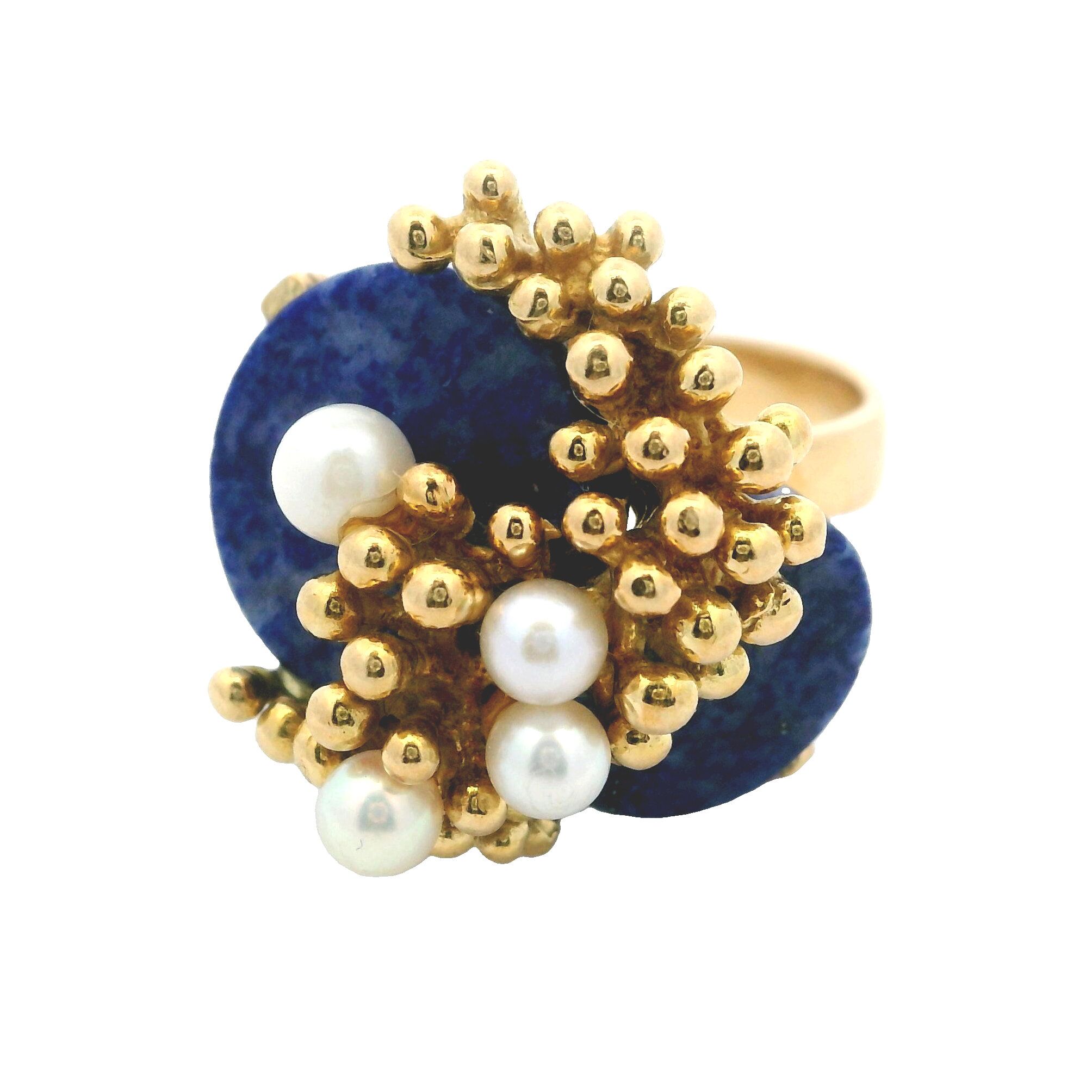18 Karat yellow gold vintage ring with 4 – 3-3.6mm cultured pearls and 2 – 11.6 mm & 9.9 mm lapis. Current size 6.