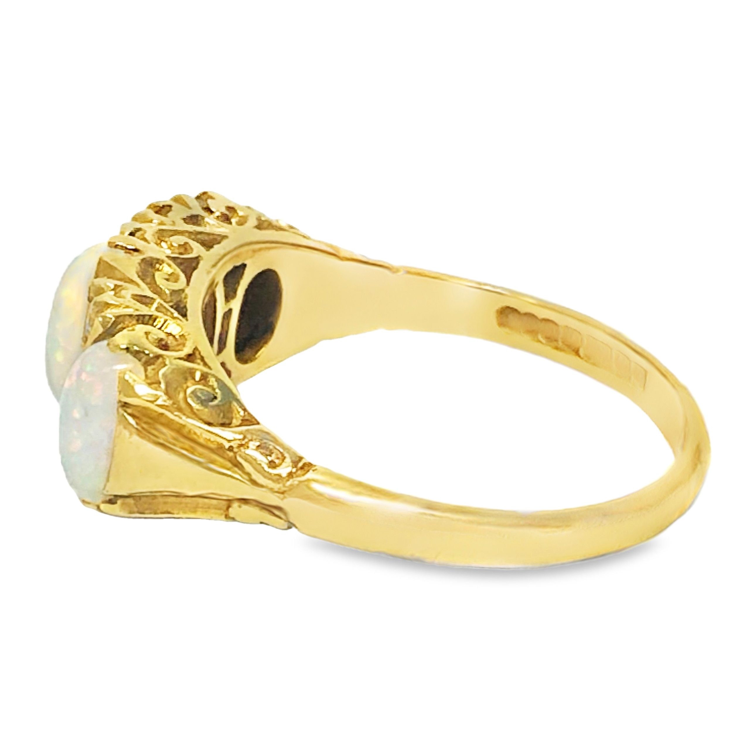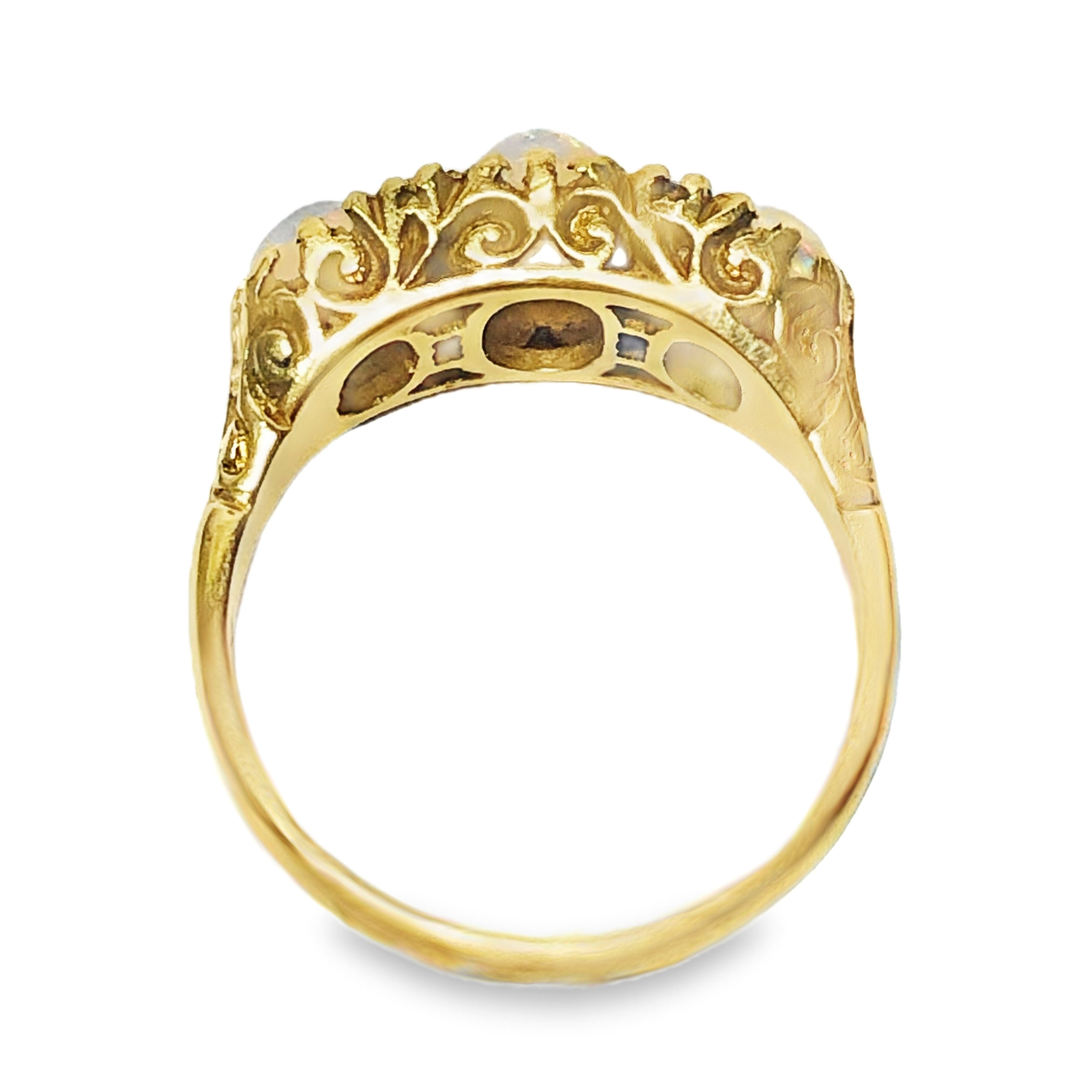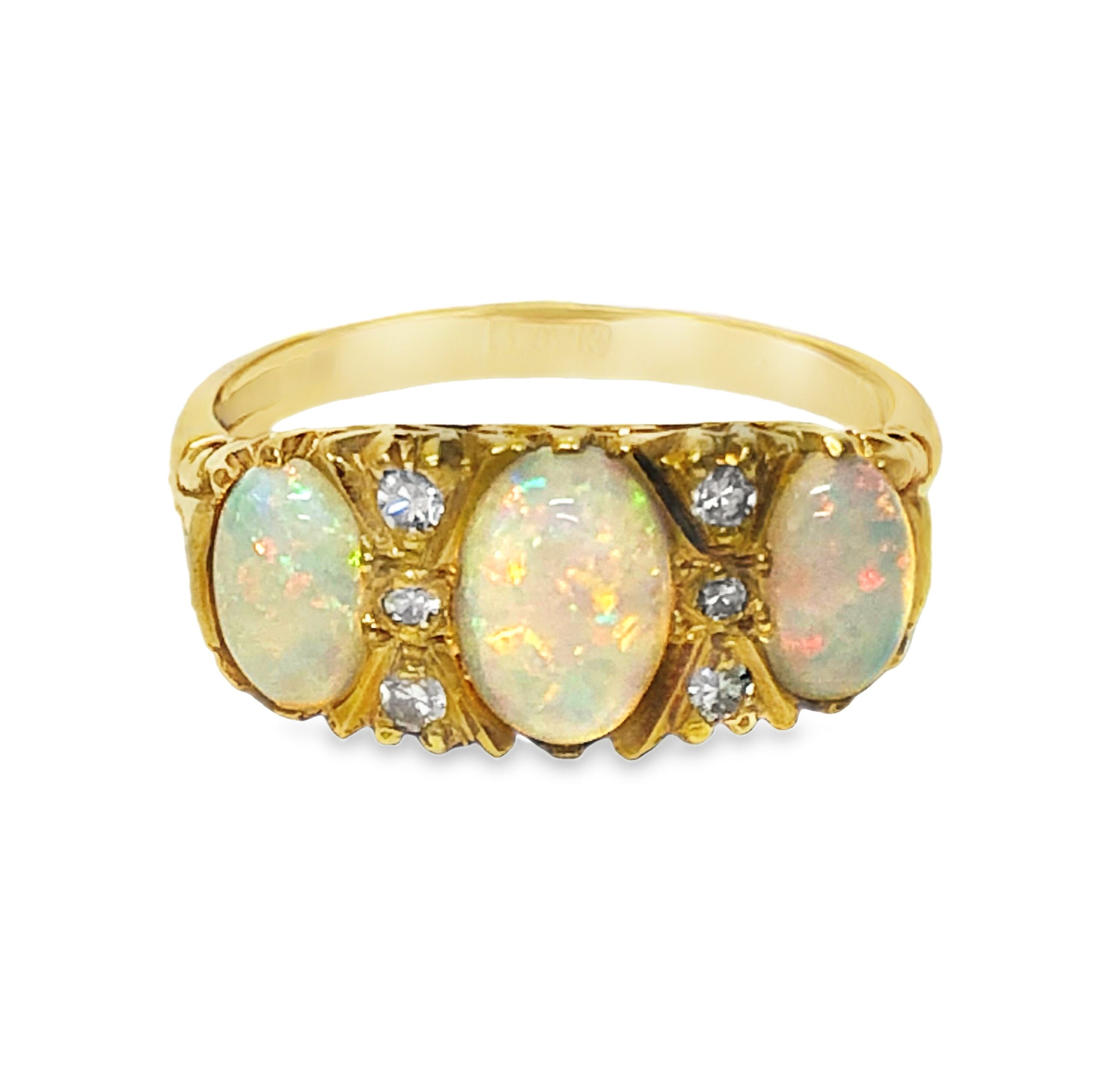 18 Karat yellow gold vintage filigree ring set with 3 oval cabochon opals and 6 diamonds totaling about 1/12 carat. Current size 8.