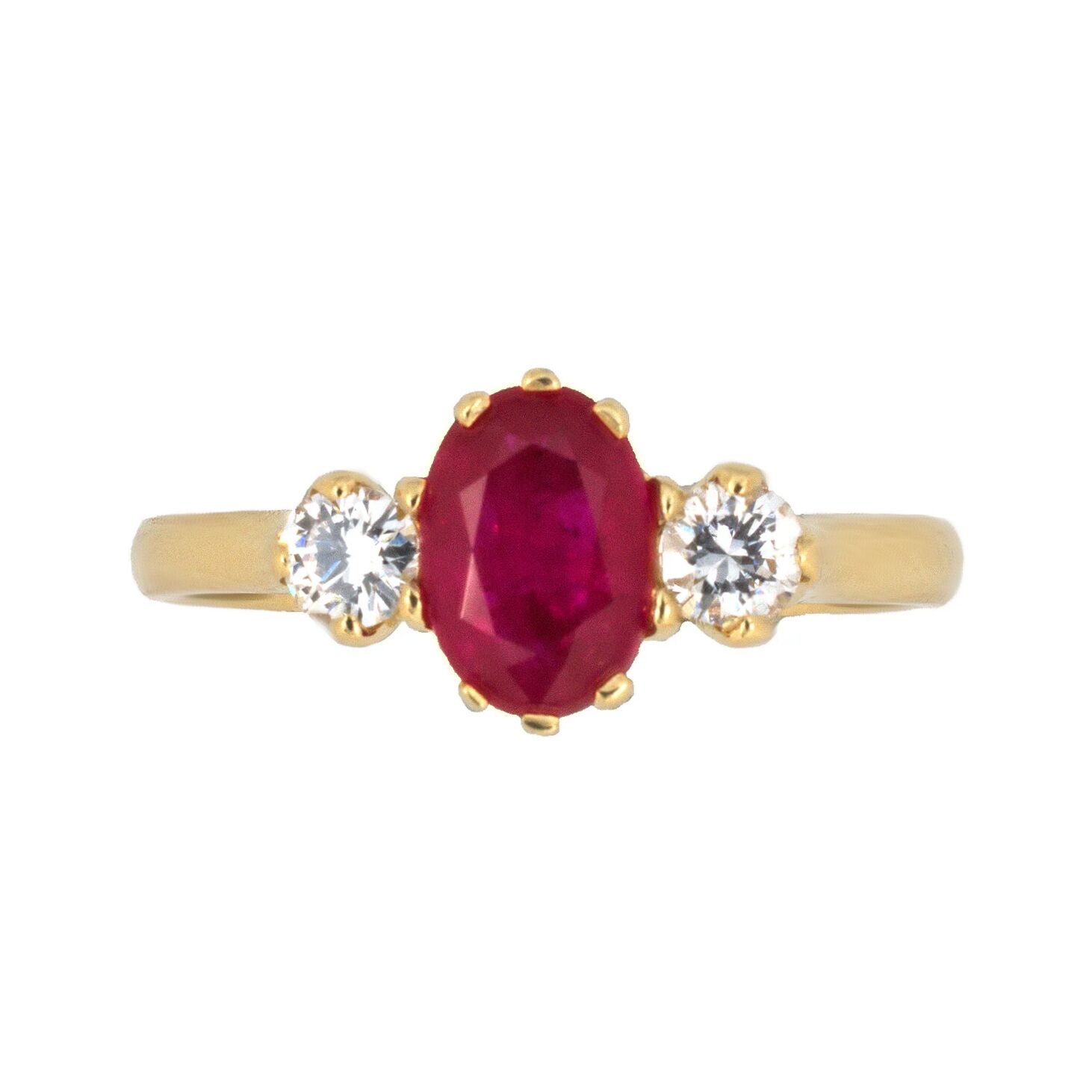 18 Karat yellow gold vintage ring set with an approximately .82 carat oval ruby and 2 diamonds totaling about .21 carat. Current size 6.