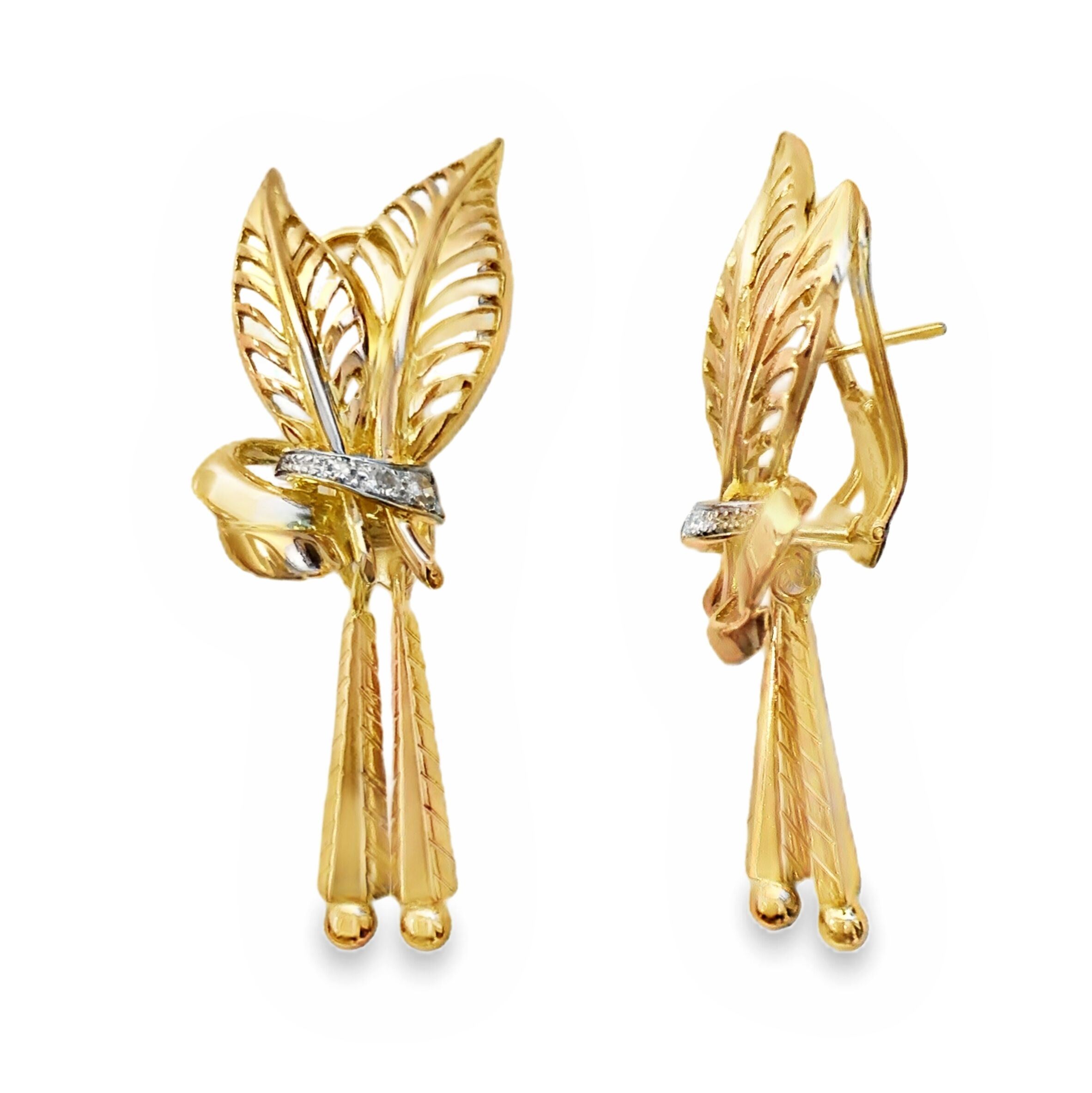 18 Karat yellow, white & rose gold Retro vintage carved open leaf earrings set with 6 diamonds totaling .20 carat. Omega post backs. 1 7/8″ in total length.