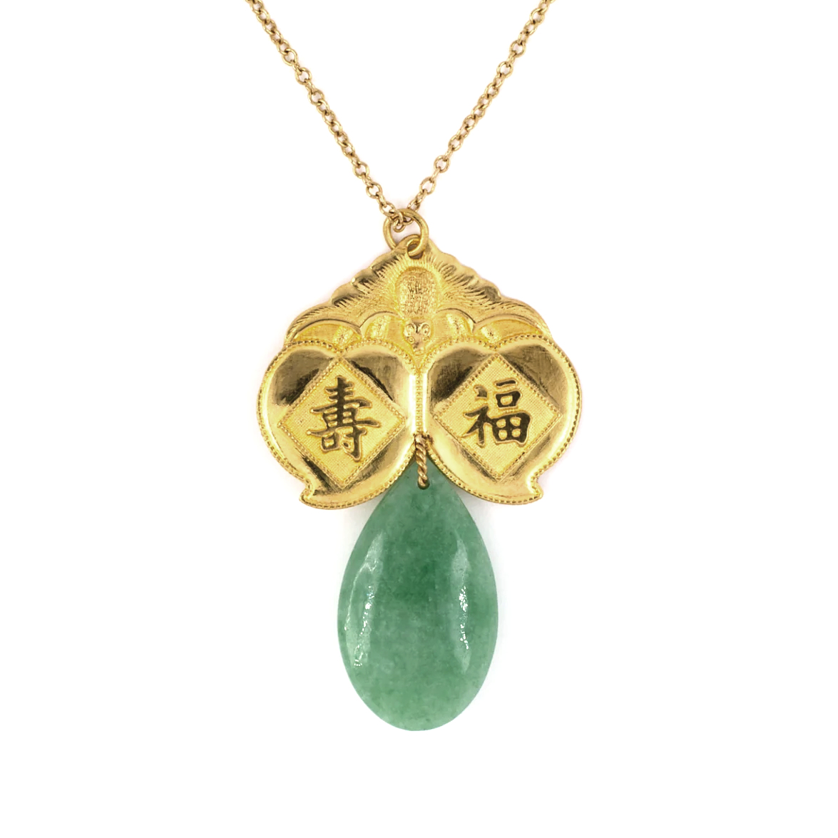 23 Karat yellow gold vintage pendant carved with Chinese symbols for good luck & longevity set with 1 pear shaped approximately 20.96 carat jadeite on an 18 Karat yellow gold 20″ cable chain. Pendant is 2″ in total length.