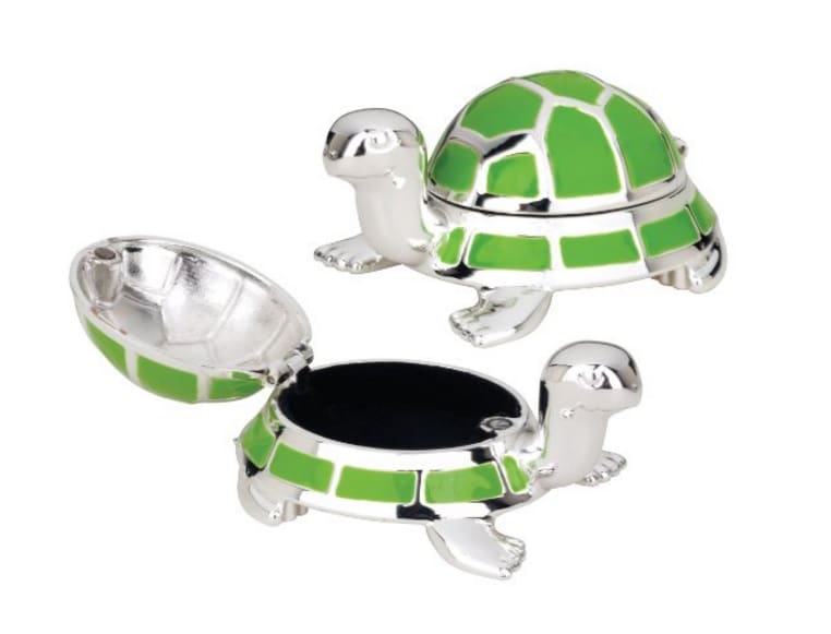 Jungle parade turtle tooth fairy box. Crafted of silverplate and enamel, magnetic latch to keep tooth safe.