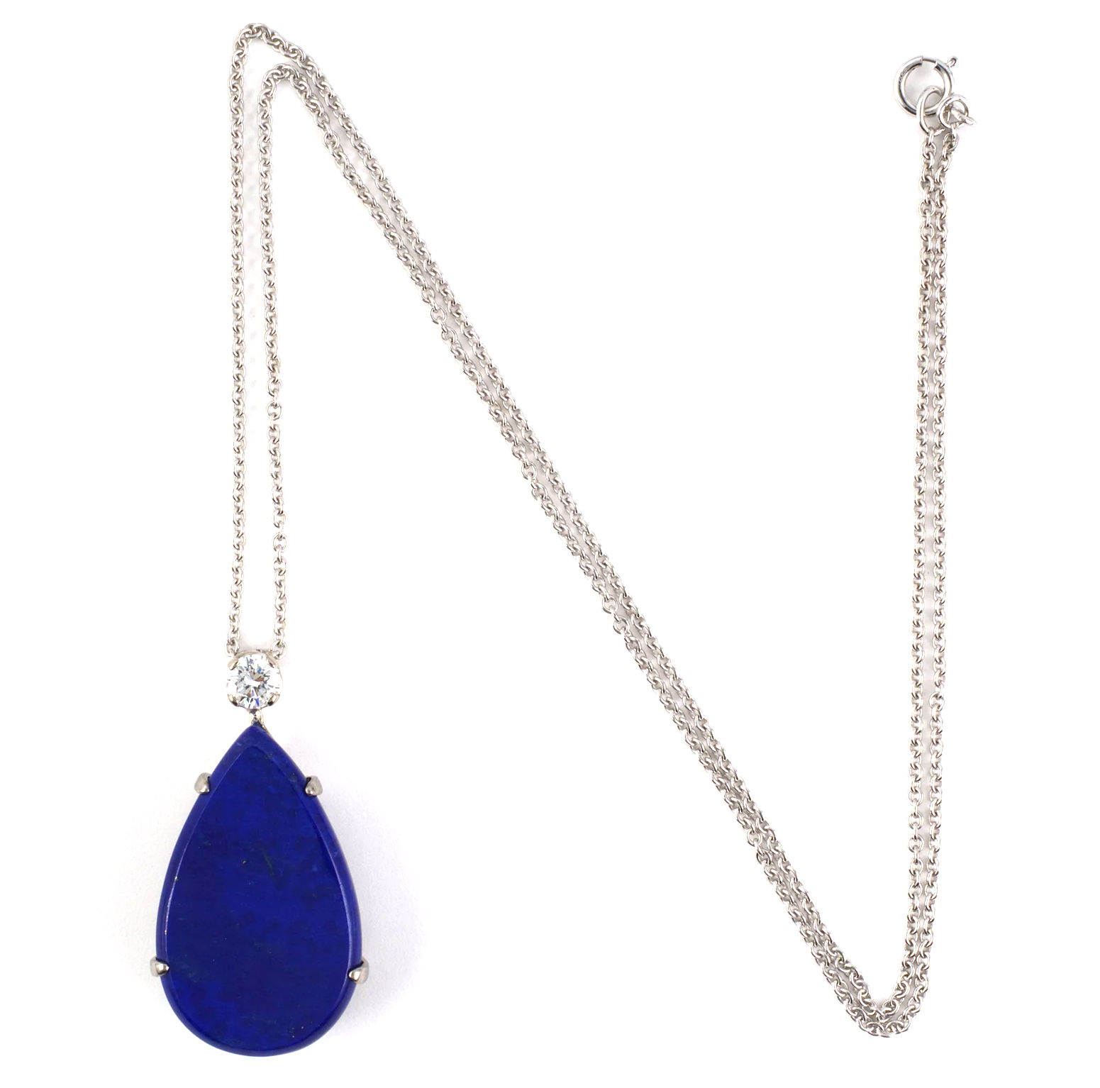 Palladium & 14 Karat white gold vintage pendant set with an approximately 12.90 carat pear-shaped lapis tablet and one approximately .25 carat diamond on an 18″ 14 Karat white gold cable chain. Pendant is 1 1/4″ in total length.