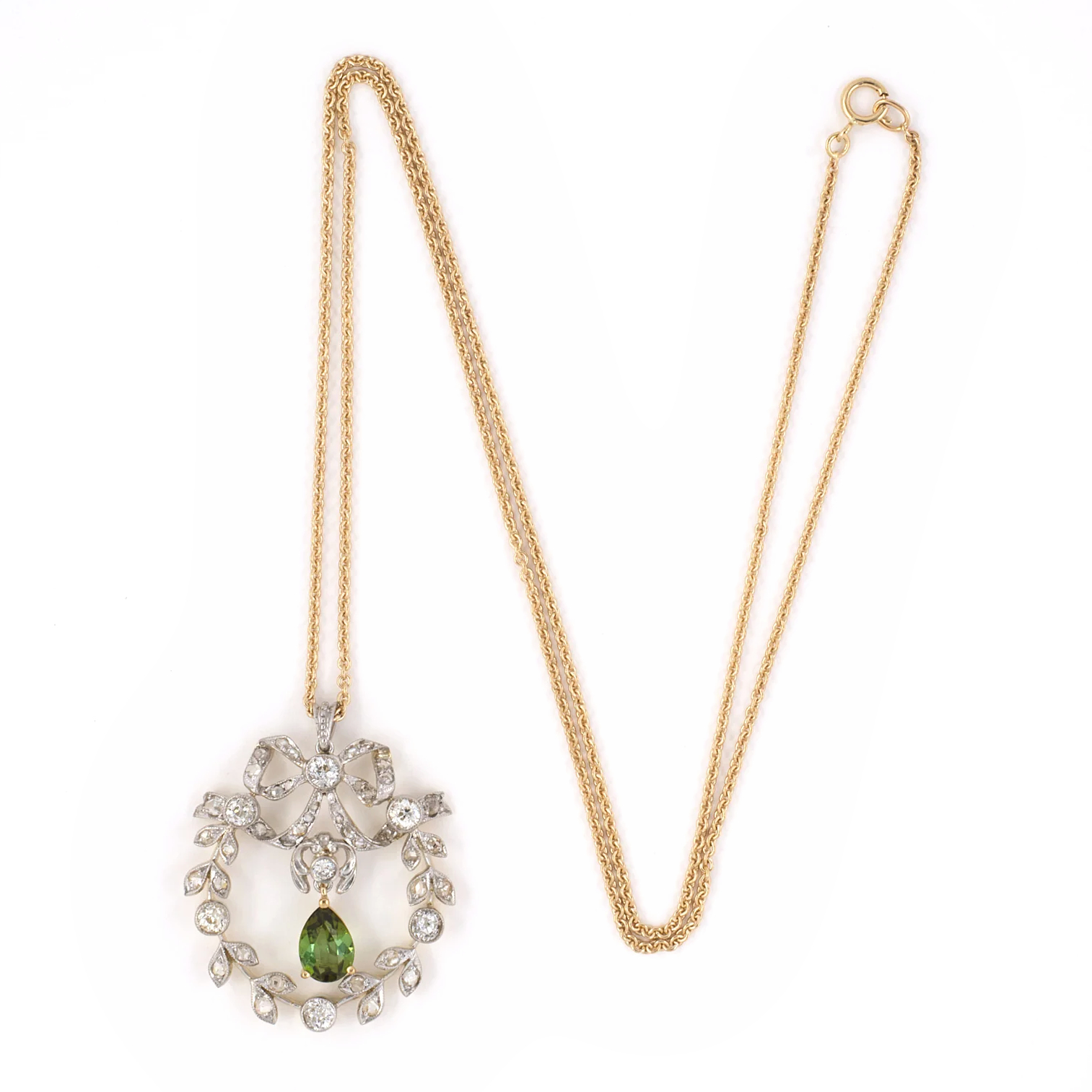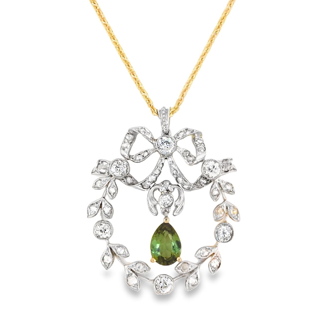 Platinum & 18 & 14 Karat yellow gold Edwardian vintage leaf & garland style wreath pendant set with 1 approximately .74 carat pear shape green tourmaline and 47 old European & rose cut diamonds totaling about 1.15 carat on an 18″ 14 Karat yellow gold cable chain. Pendant is 1 1/8″ in total length.