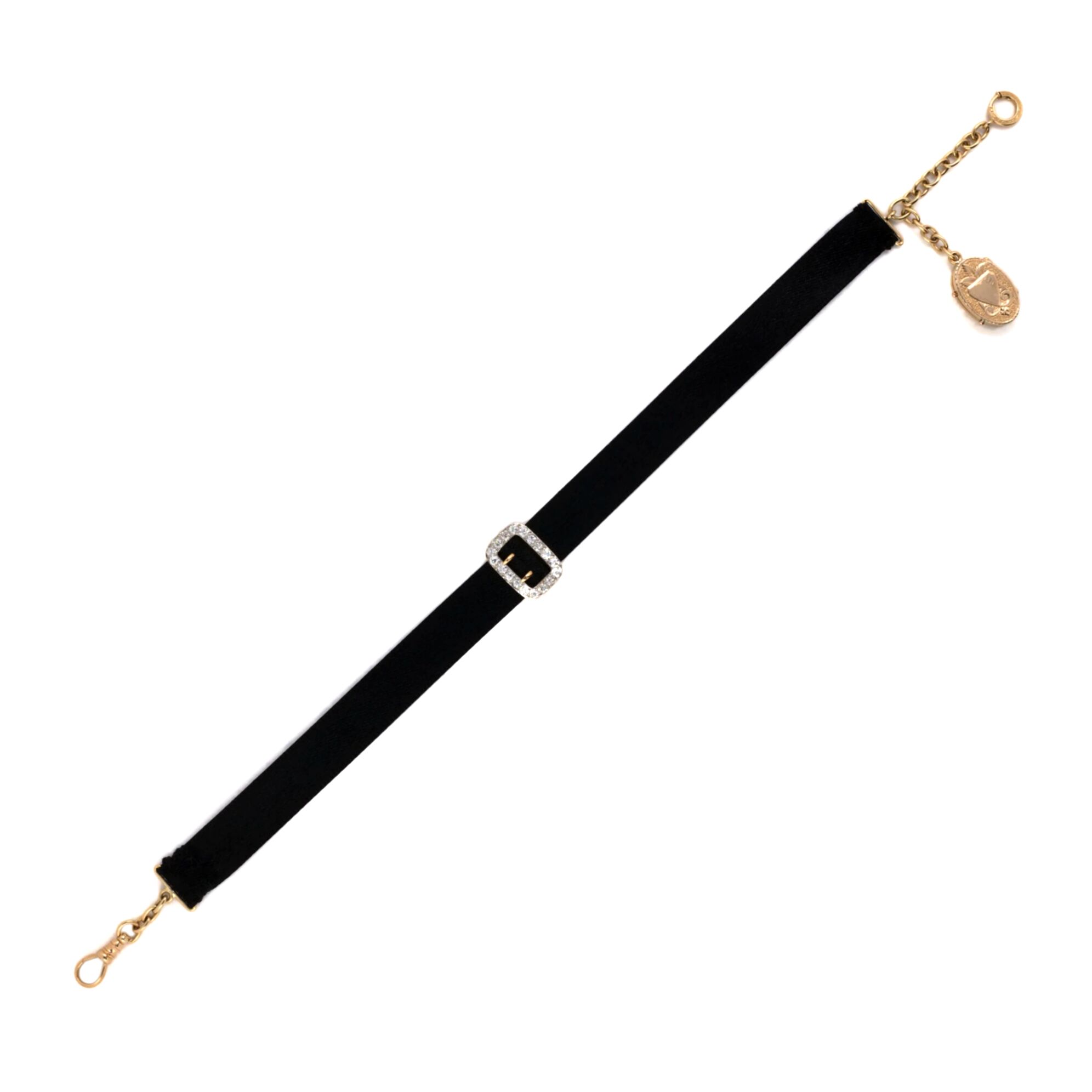 Platinum & 18 Karat yellow gold Edwardian vintage black satin watch fob with Victorian locket, buckle set with 18 old European cut diamonds totaling about 1.25 carat and 14 Karat yellow gold snap swivel