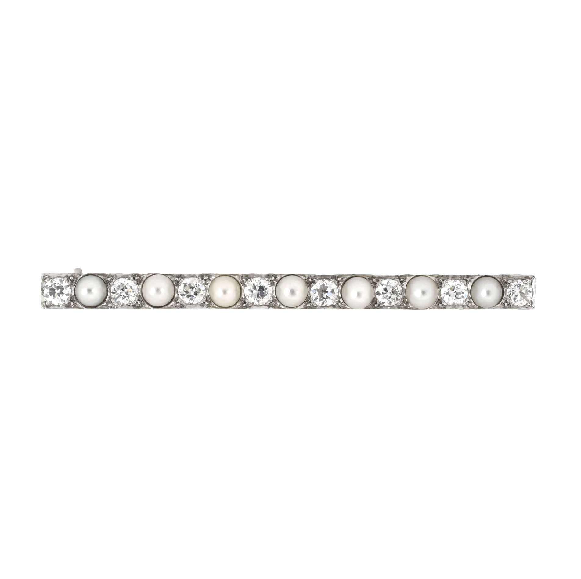 Platinum Art Deco vintage bar pin set with 8 old European cut diamonds totaling about .95 carat and 7 natural pearls. 2 1/8″