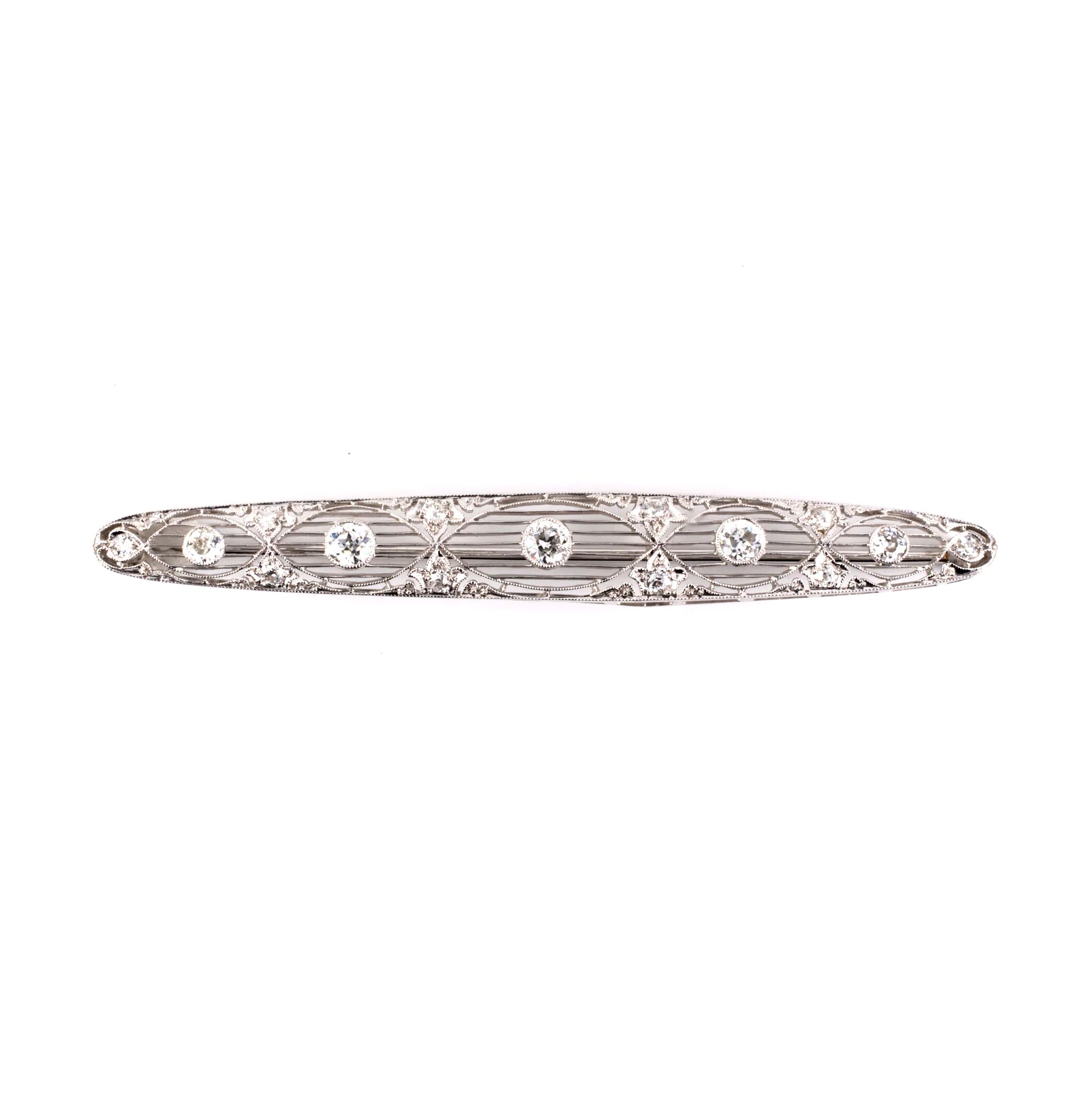 Platinum Art Deco vintage filigree bar pin set with 15 early brilliant, old European, single, and Swiss cut diamonds totaling about 1.40 carat. 3″ x 3/8″