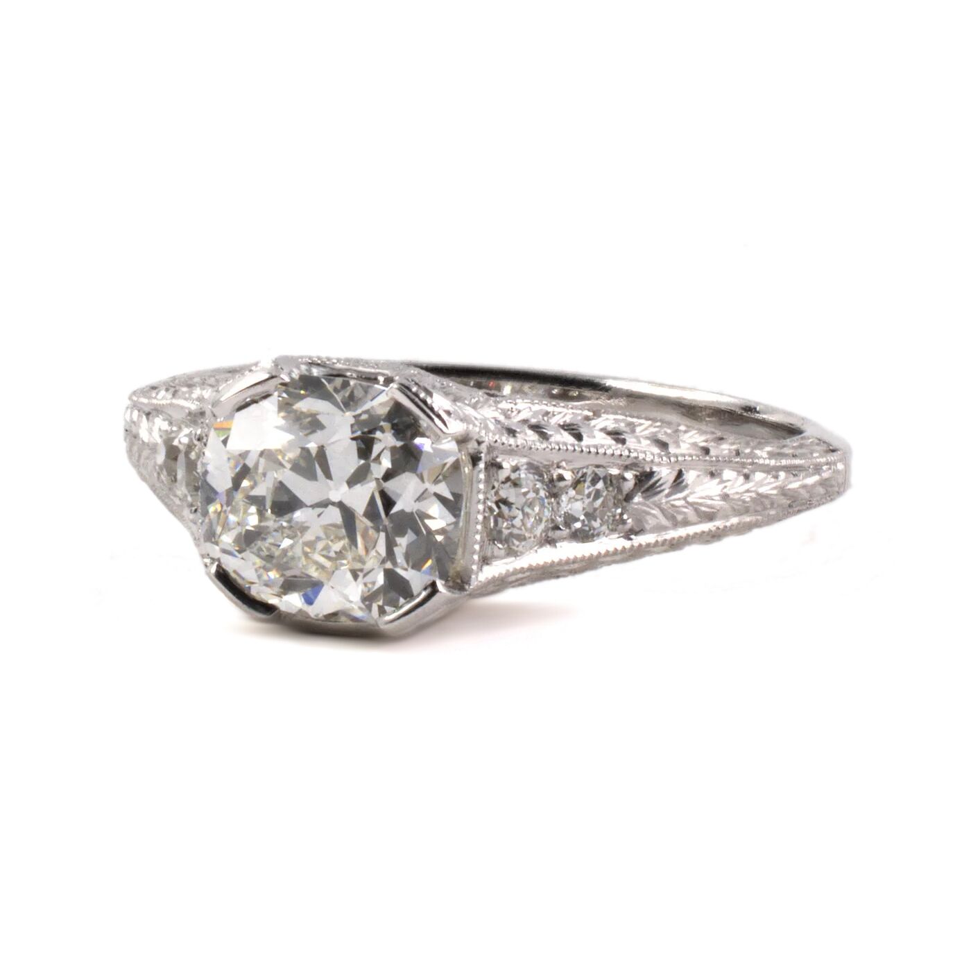 Platinum Edwardian vintage chased ring set with an approximately 1.17 carat antique cushion shaped center diamond and 4 side diamonds totaling about .19 carat. Current size 5 3/4.