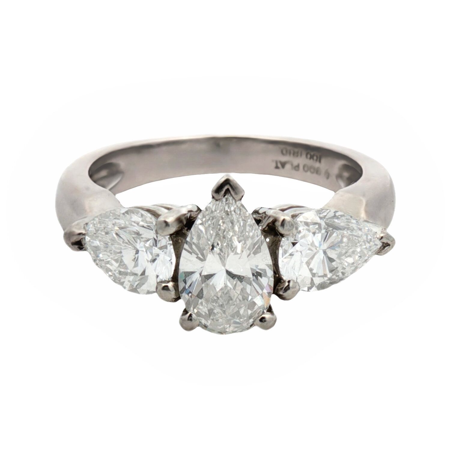 Platinum engagement style ring set with an approximately .92 carat pear-shaped center and 2 pear-shaped sides totaling about 1.44 carat. Current size 7. Pre-owned.