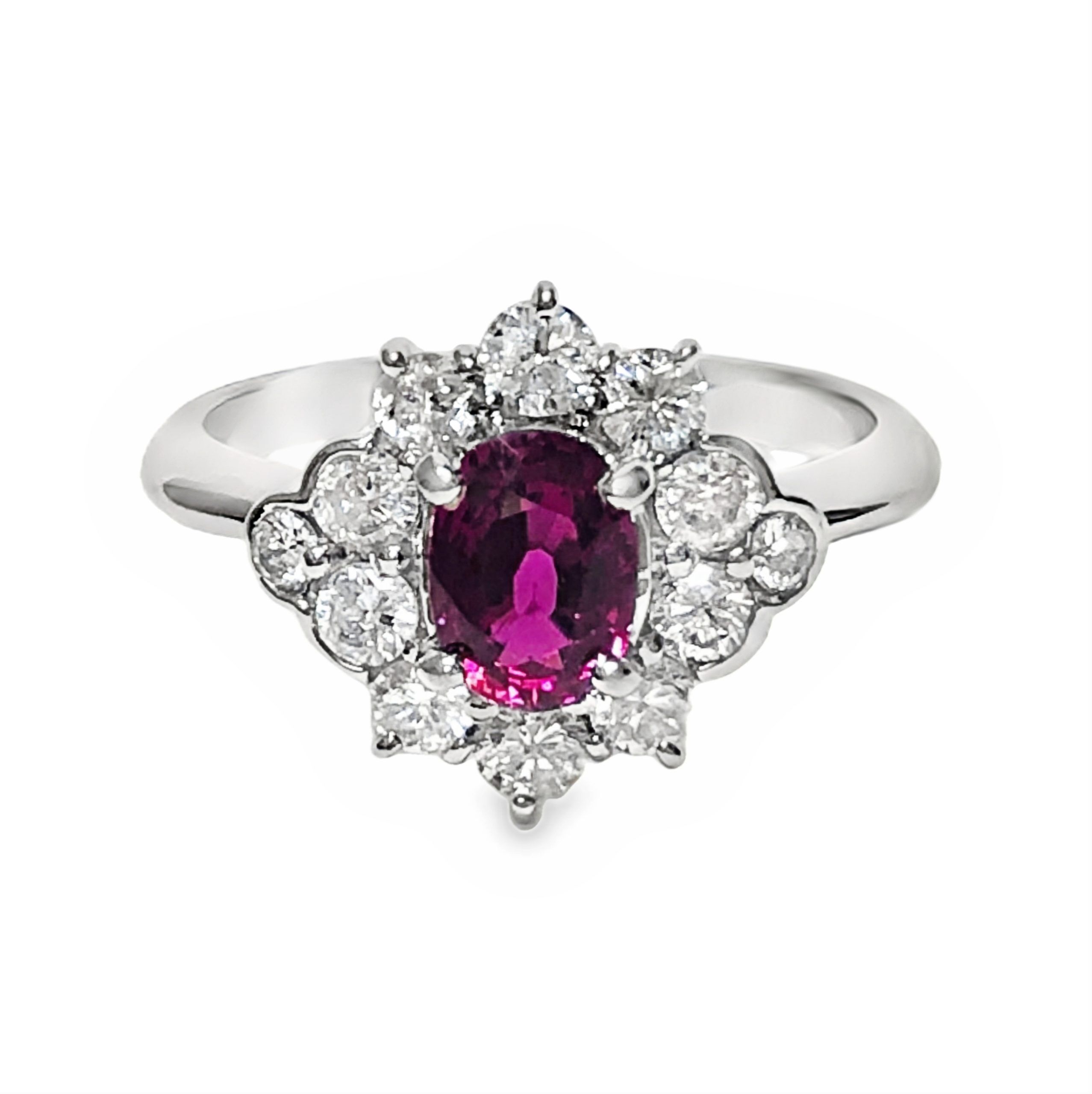 Platinum vintage ring set with a 6.5 x 4.8 x 3.4 mm, approximately 1.05 carat rubellite tourmaline and 12 diamonds totaling about .73 carat. Current size 6 3/4.