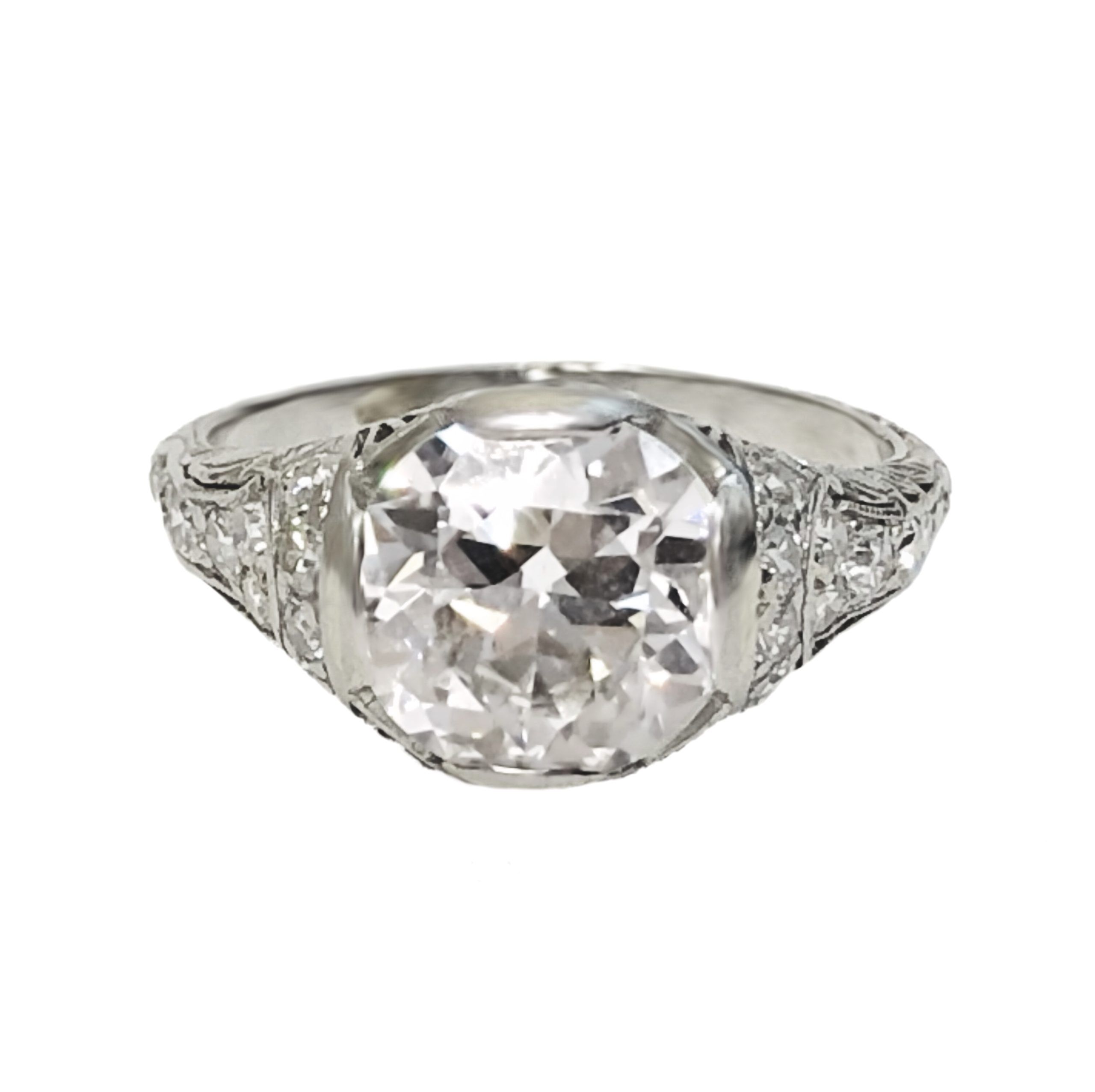 Platinum vintage filigree ring set with an approximately 2 3/4 carat old European cut diamond and 42 single cut & Swiss cut diamonds totaling about 1 carat. Current size 7 1/2.