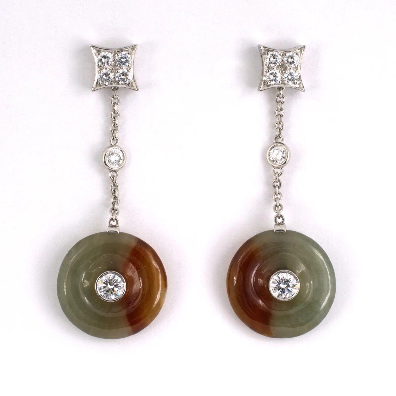 Platinum vintage dangle chain earrings set with 2 – 16 mm torus jadeites totaling about 13.26 carats and 12 diamonds totaling about .88 carat. Friction backs. 1 5/8″ in total length.