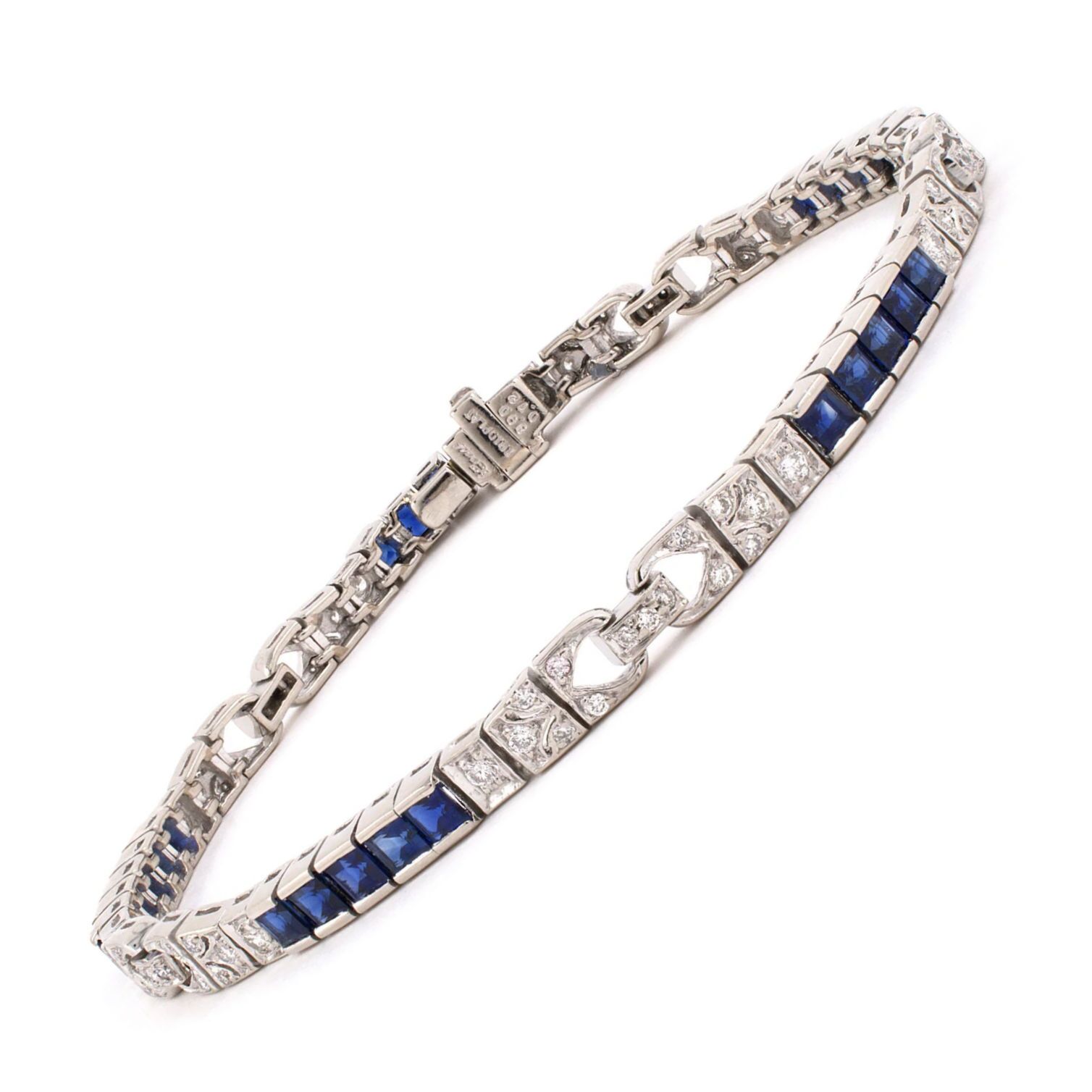 Platinum vintage Art Deco style bracelet set with 75 diamonds totaling about .72 carat and 25 square sapphires totaling about 3.90 carats. 7 1/8″