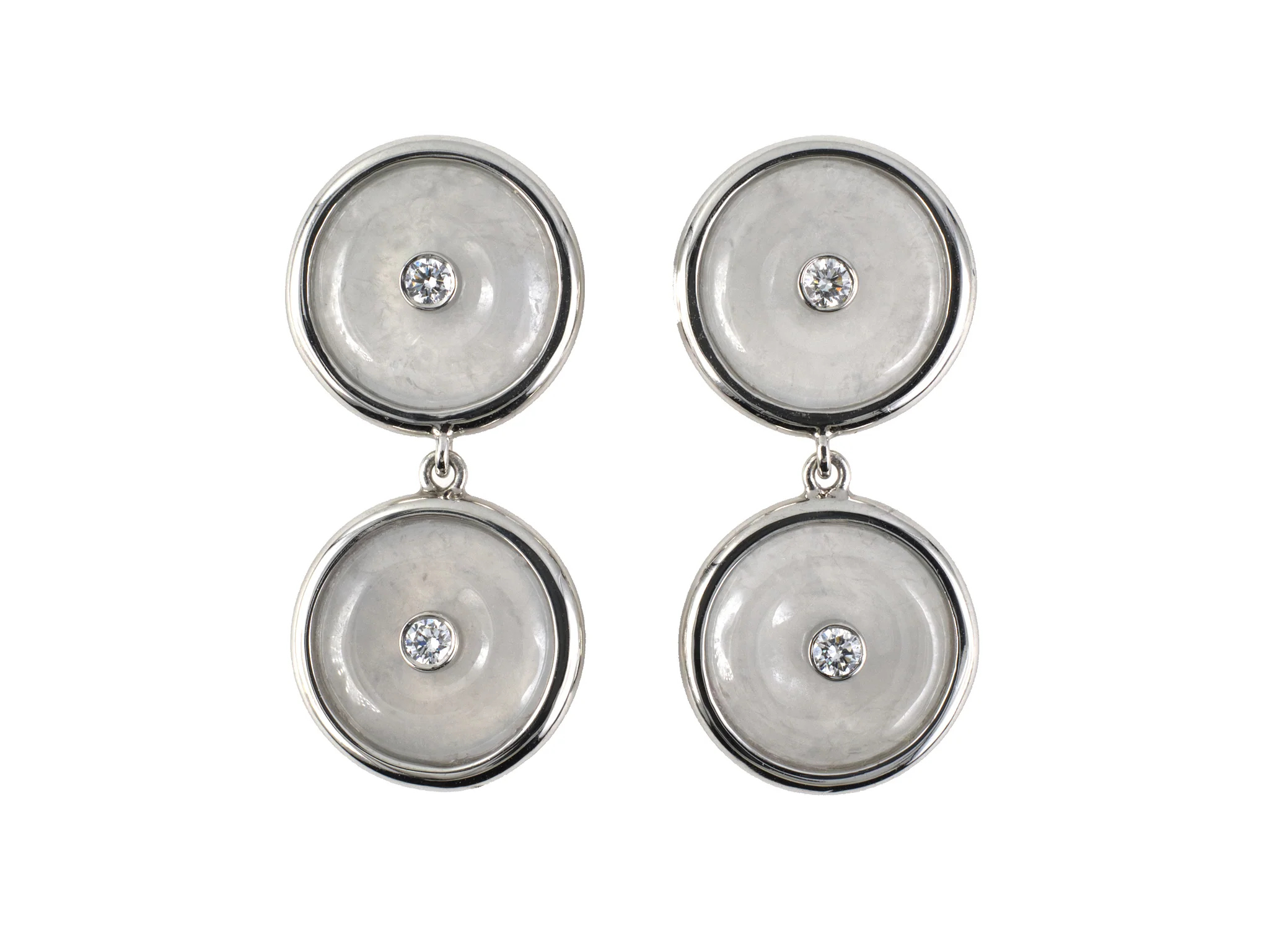 Platinum vintage drop earrings bezel set with 4 white jadeites totaling about 9.26 carats & 4 diamonds totaling .13 carat. 1″ in total length. Friction backs.