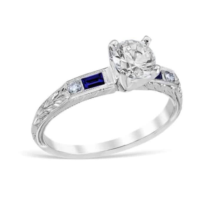 14 Karat white gold vintage-inspired engagement ring mounting with two diamonds totaling .06 carat and two sapphires totaling .15 carat. Current size 6.5.