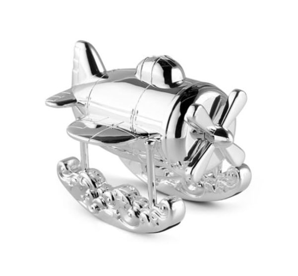 Silver plated airplane bank with movable propeller. Dimensions: 4″H x 5″L x 5″D.