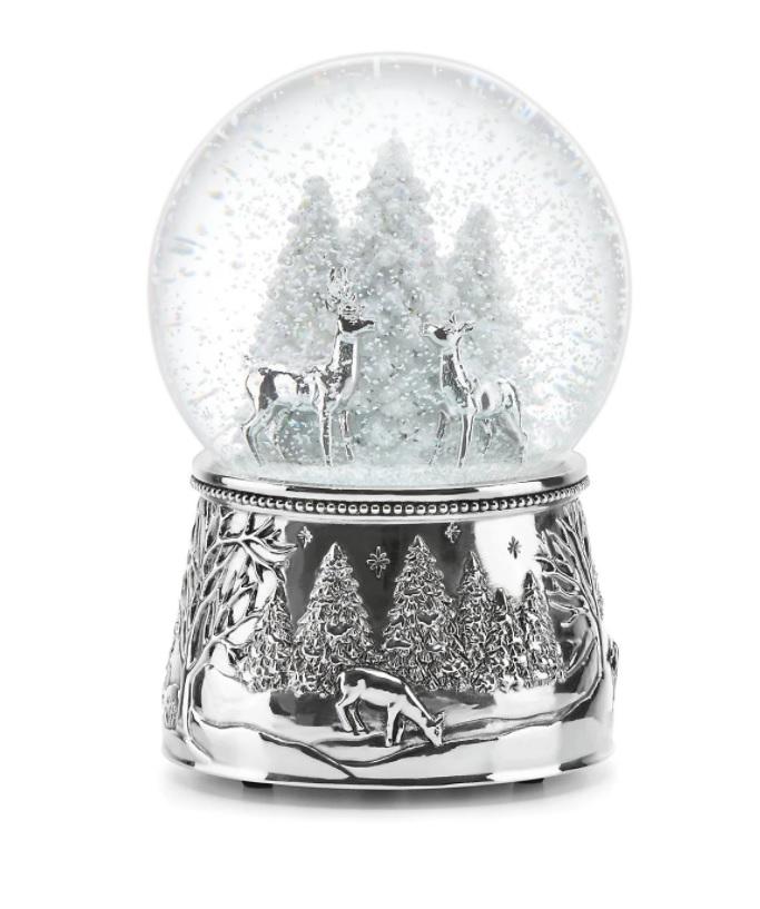 Silverplate crystal musical snow globe with snow-covered trees and deer. Plays “Silent Night”. 6″ high.